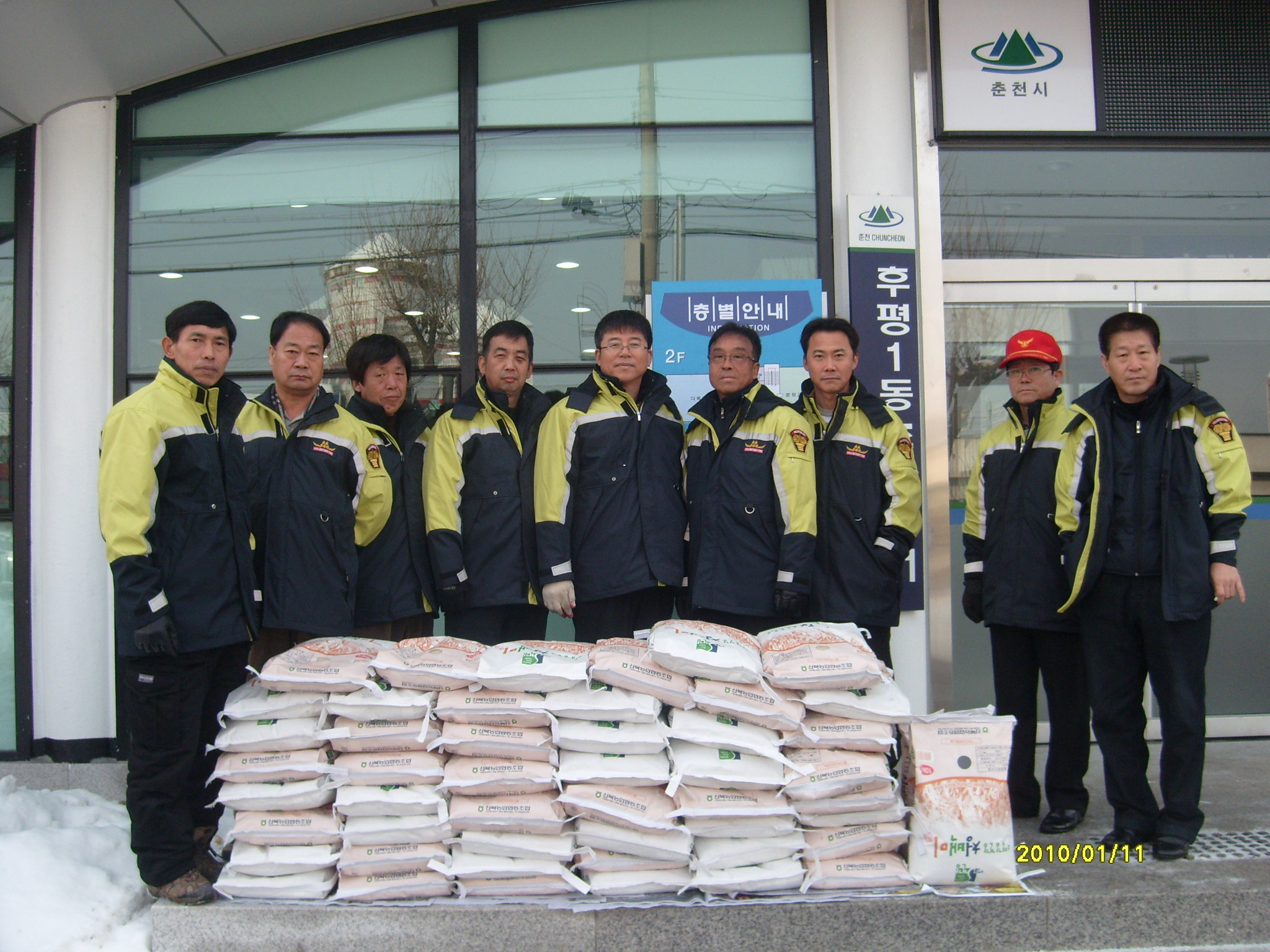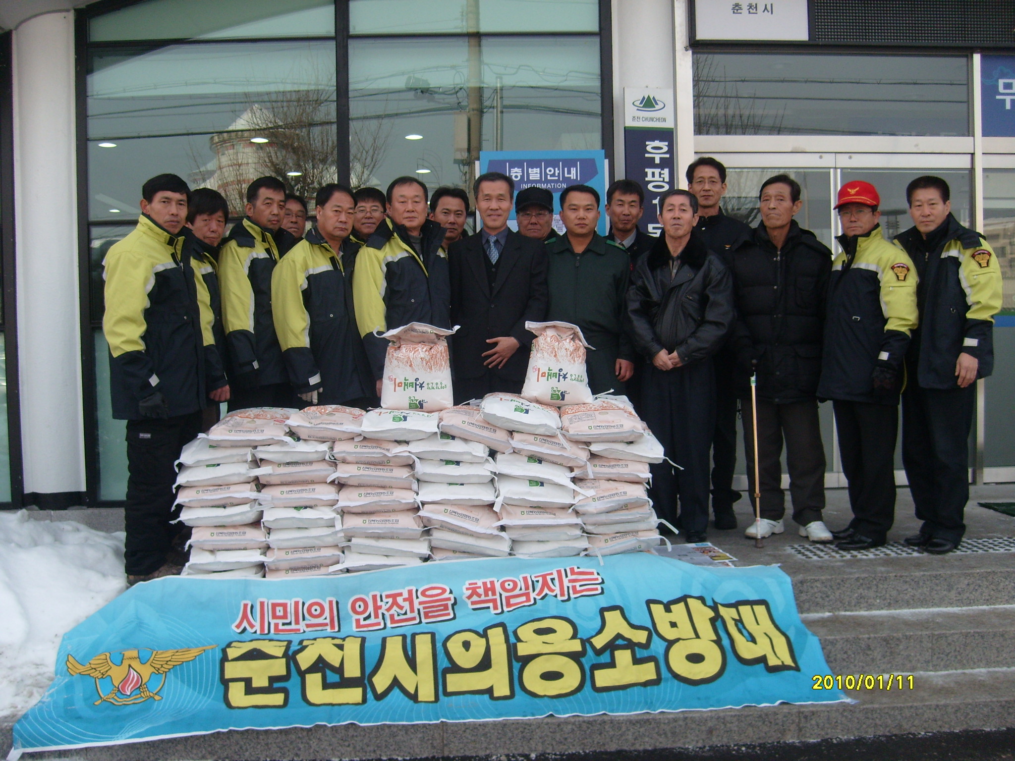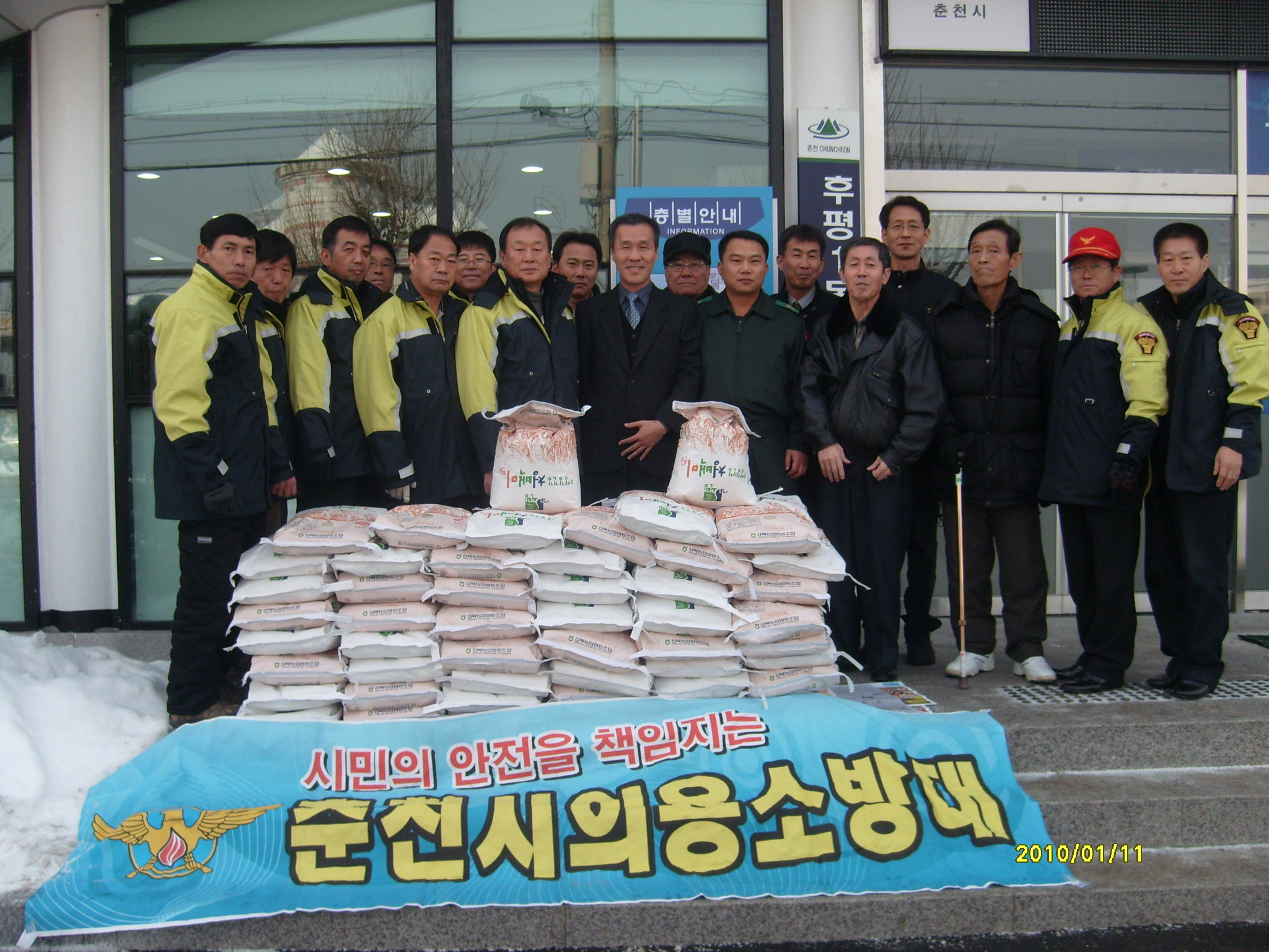 춘천의용소방대(대장 이돈균) 11일 후평1동 자치센타를 방문하여 독거노인및 소년소녀 가장에게 쌀 50포(10kg)를 전달하였습니다.