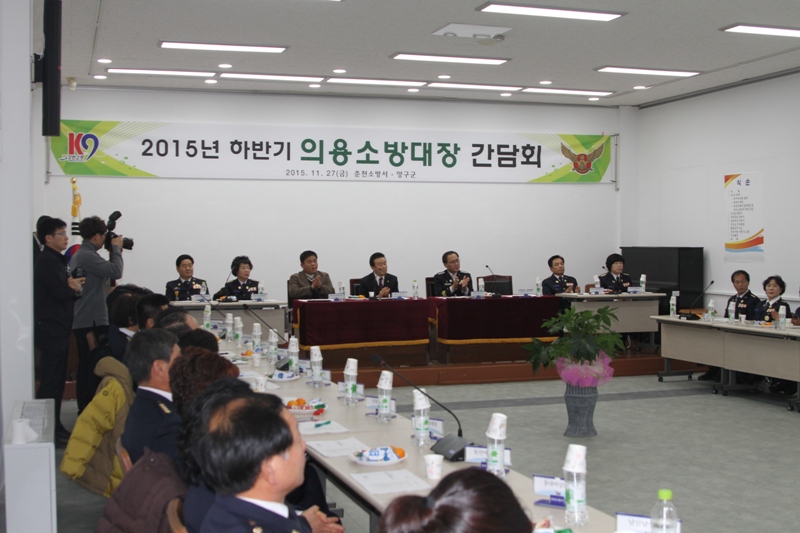 춘천소방서(서장 박창진) 소속 춘천시, 화천군, 양구군 의용소방대 대장님들과 전창범 양구군수님, 김철 양구군의회 의장님 등 60여명이 참석한 가운데 2015년 하반기 의용소방대장 간담회를 11. 27(금) 양구문화복지센터 세미나실에서 개최하였습니다.