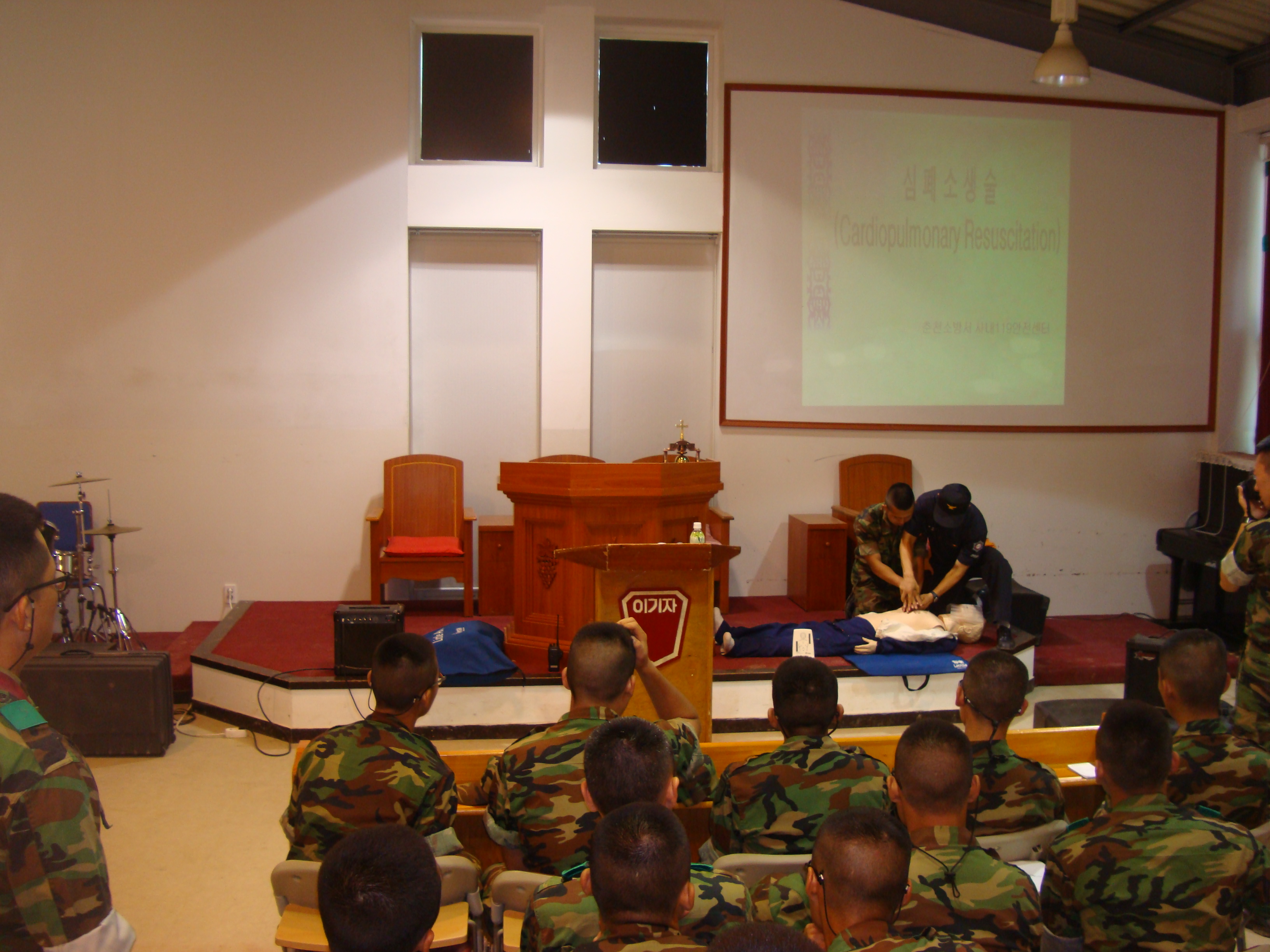 사내119안전센터에서는 관내 군부대 장병들에 대한 응급처치교육 및 화재안전교육을 실시하였습니다. 27사단 78연대 강당에서 2010.08.20. 10:00 ~ 11:00까지 장병 300명을 대상으로 실시한 이번 교육에서는 성인심폐소생술, 기도폐쇄응급처치, 열손상환자응급처치, 뱀.벌등에 의한 교상 응급처치, 골절환자응급처치 및 화재안전교육을 실시하였으며 더운 날씨에도 불구하고 장병들의 뜨거운 교육열을 엿볼 수 있었습니다. 이번 교육이 장병들에게 많은 도움이 되기를 바라며 사내119안전센터는 관내 안전을 위해 교육훈련에 더욱 매진할 것을 다짐합니다.