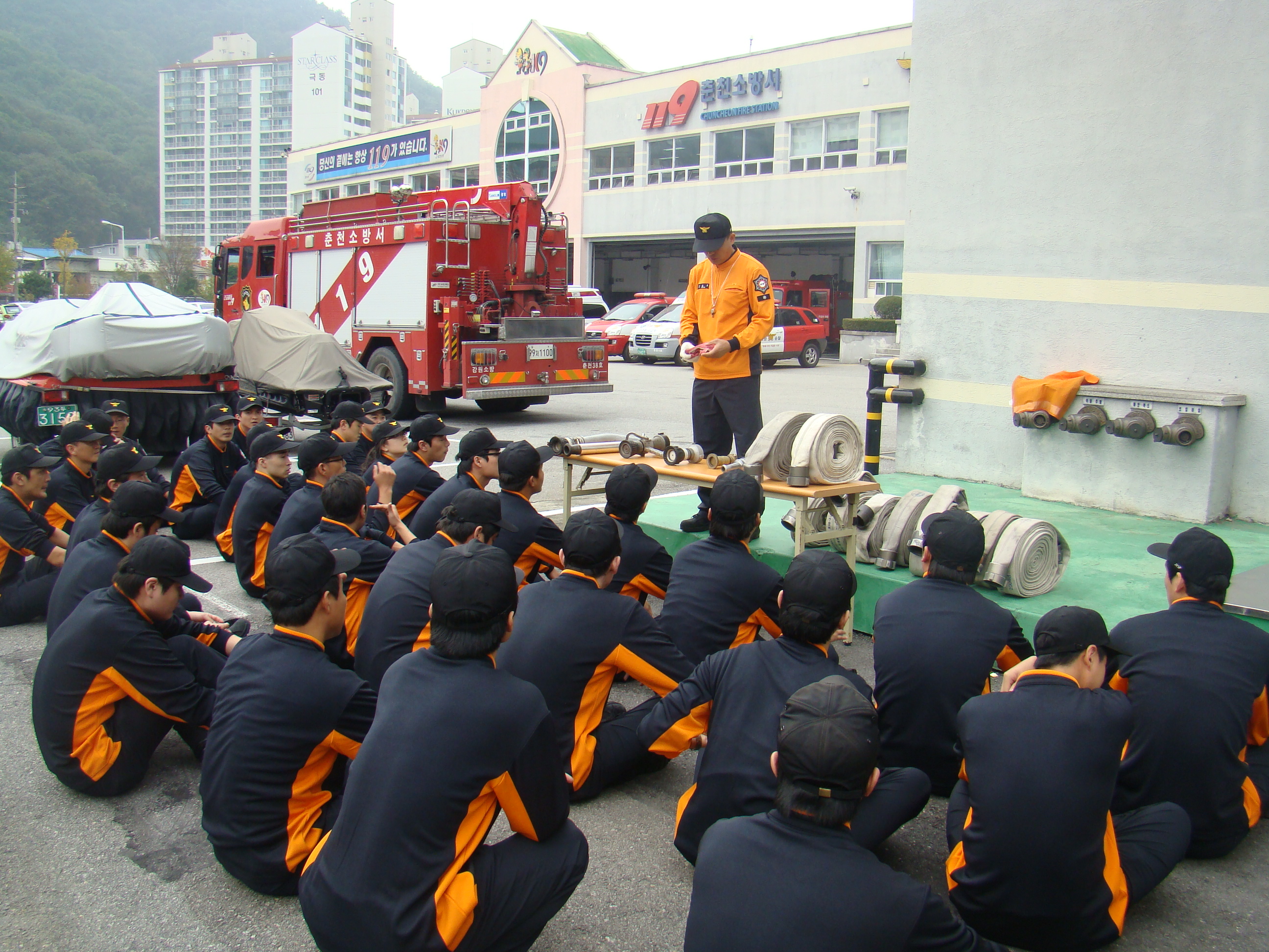 춘천소방서(서장 조완구)는 2010. 10.7일자 신규임용자 30명에 대한 자체 직무교육을 실시합니다. 교육은 각 과의 과장,담당의 강의와 센터,대장의 실습훈련으로 진행중이며, 신규임용자 모두 난생처음 입어보는 방화복을 입고 땀을 흘리며, 훈련에 임하고 있습니다. 신참들에게 격려의 박수를 보냅니다.