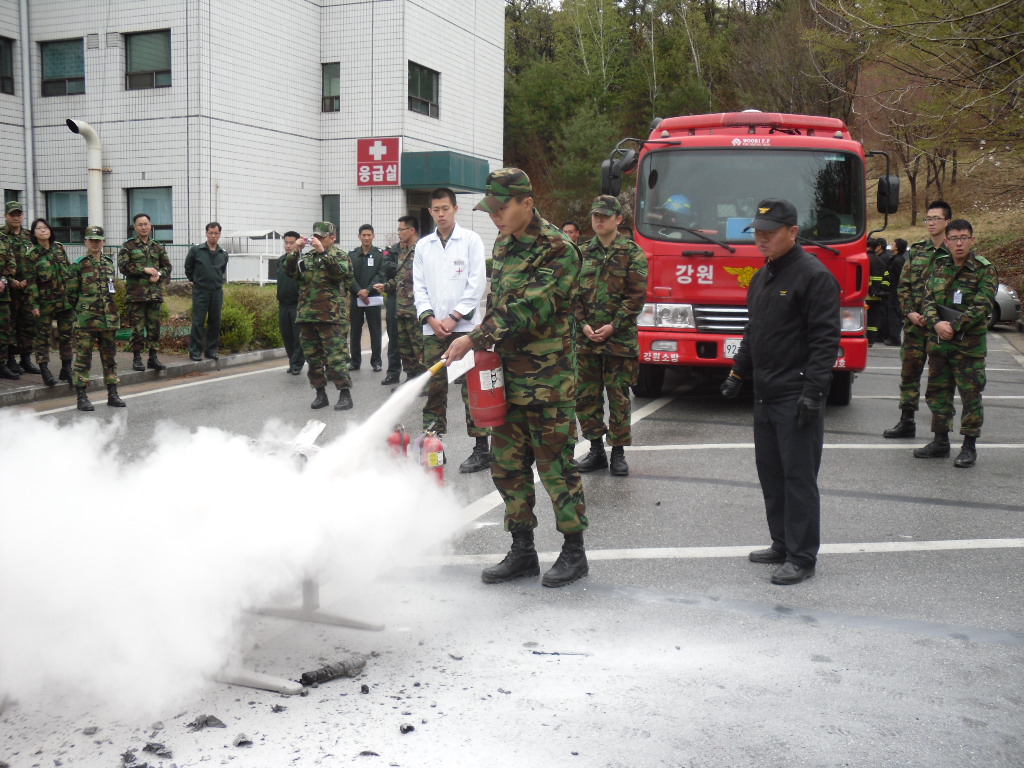 춘천소방서 후평119안전센터(센터장 정희정)는 2011. 4. 27 15:00~17:00까지 춘천국군병원 본관동 / 연병장에서 병원 전 장병 및 군무원 , 입원환자들을 대상으로 화재예방교육 및 화재진압훈련을 실시하였습니다