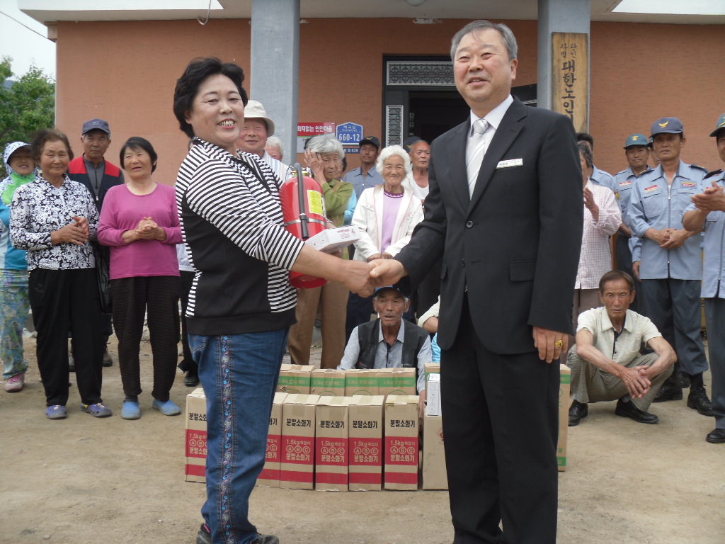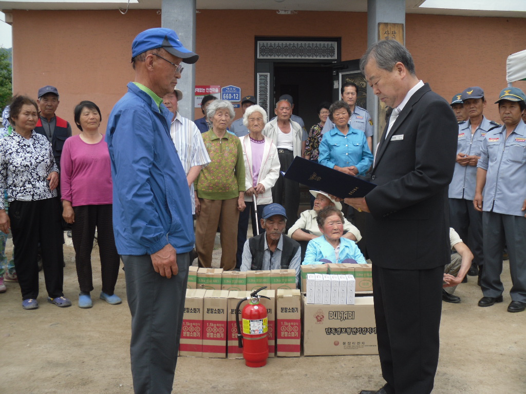 이 날 현판식에서는, 노인회장님 명예소방관 위촉과 마을 어르신에 대한 기초 소방시설 사용 및 관리요령 소방안전교육, 각 가정에 대한 감지기 및 소화기 배부(설치) 및 주택안전점검 등을 통하여 지역주민 소방안전의식 함양과 화재로 인한 피해 최소화에 만전을 기하는 등 소방사각지대 해소에 일익을 담당하였습니다.