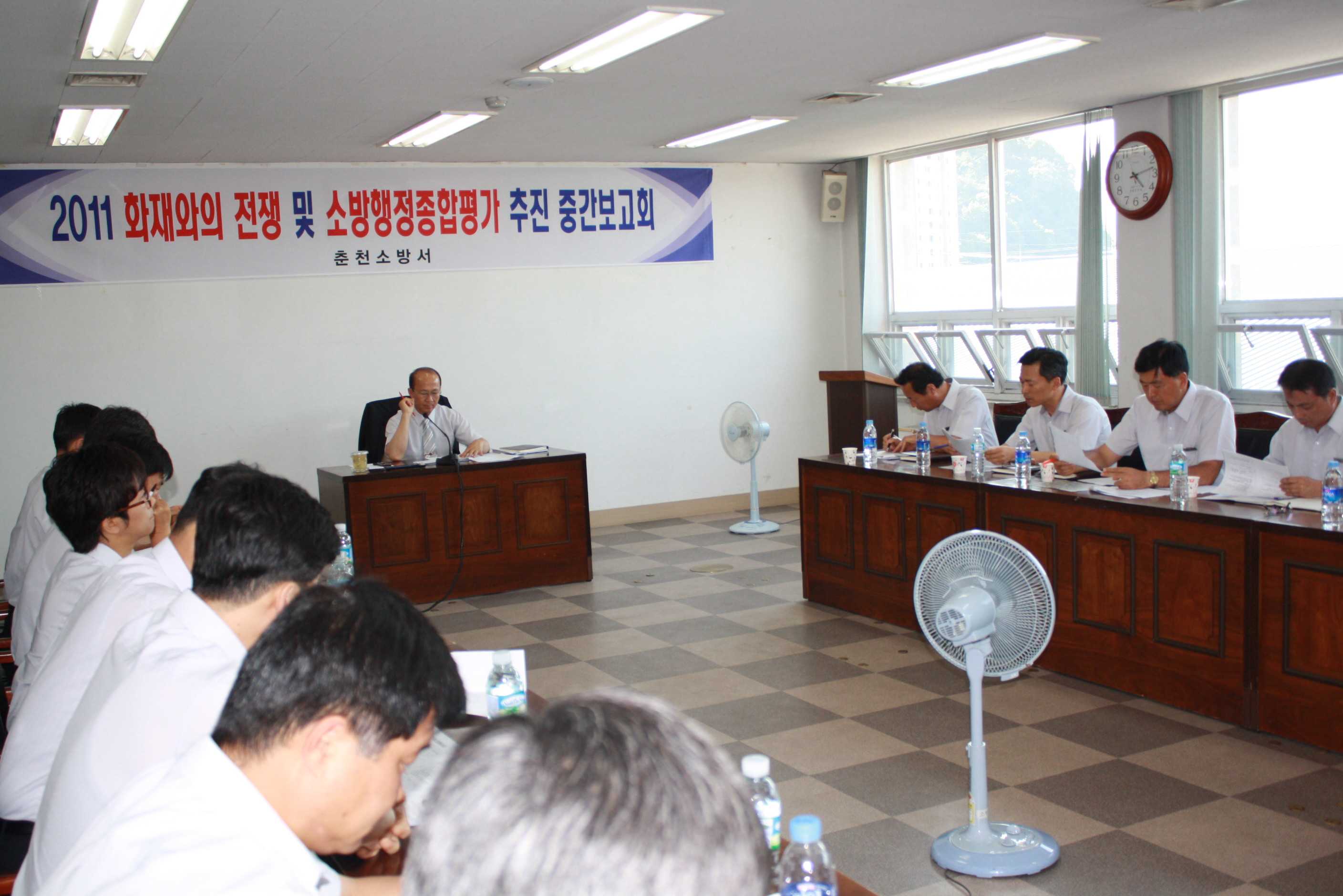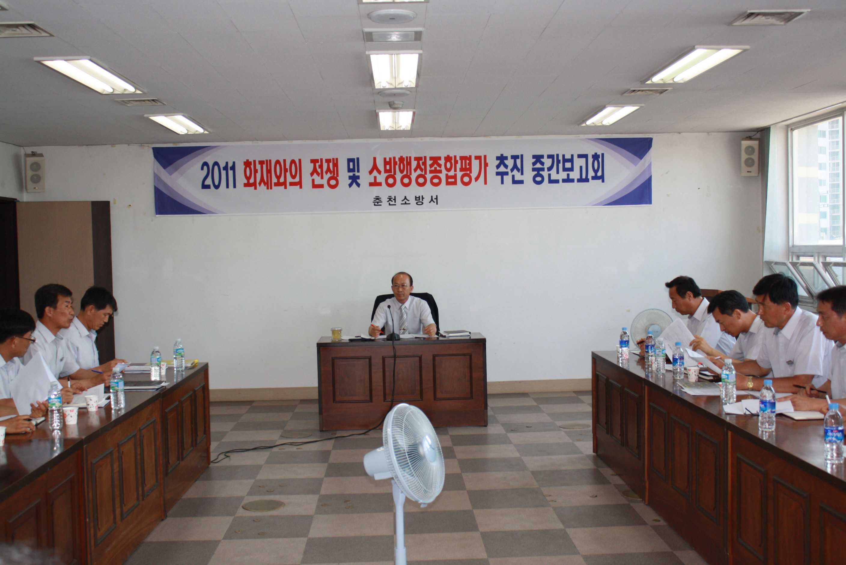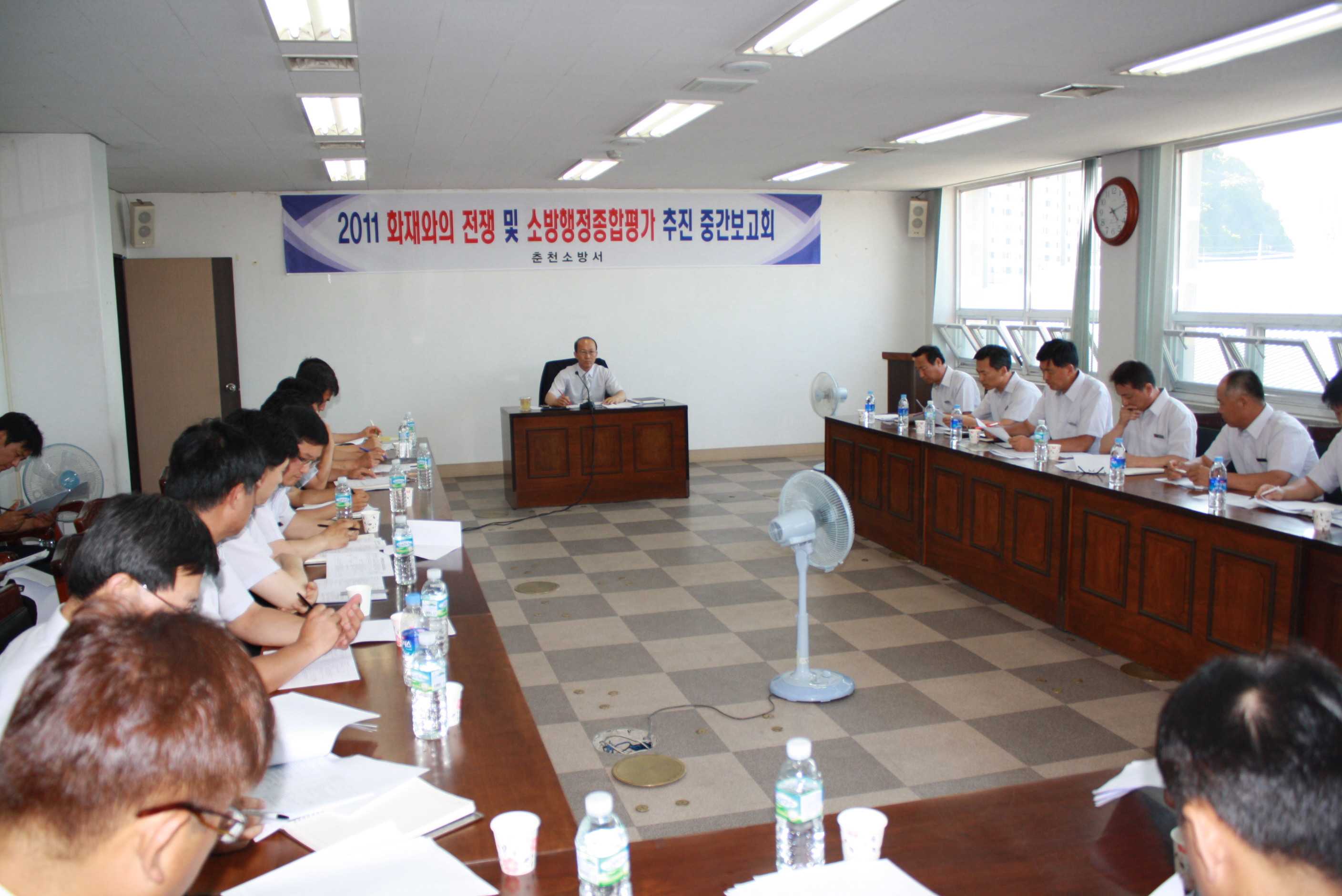 춘천소방서(서장 조완구)는 2011. 6. 14(화) 16:00~ 소회의실에서 "화재와의 전쟁 및 소방행정종합평가 추진 중간보고회"를 개최하고, 그간 추진된 2단계 화재와의 전쟁 수행 및 소방행정종합평가 지표별 추진현황을 검토분석 하였습니다.