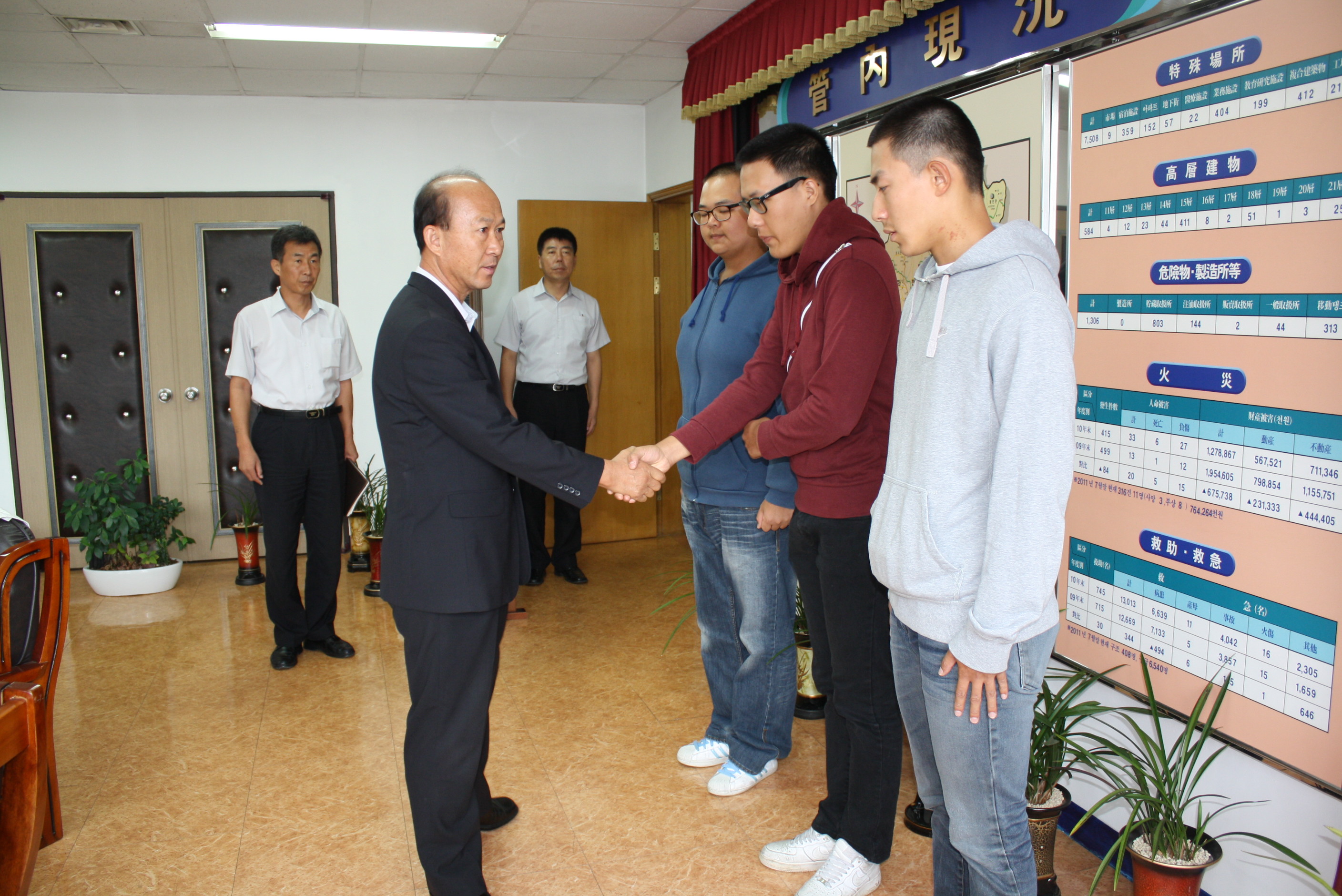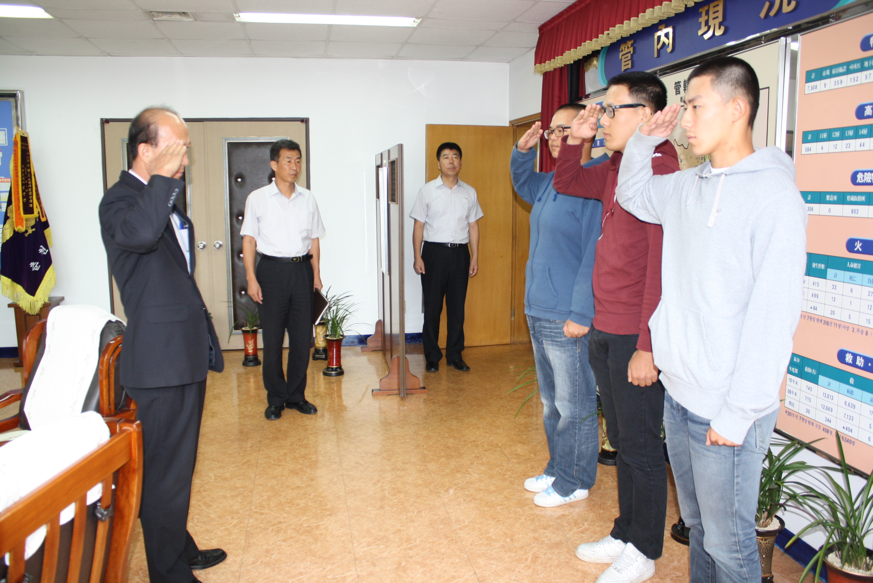 춘천소방서(서장 조완구)에서는 2011.09.19 일자로 신규임용된 공익근무요원(윤성민, 최동훈, 이재형)의 신고식을 가졌습니다. 서장님께서는 앞으로 건강하고 즐겁게 근무할것을 말씀하셨고, 또한 자기계발에도 힘쓸것을 당부하셨습니다.