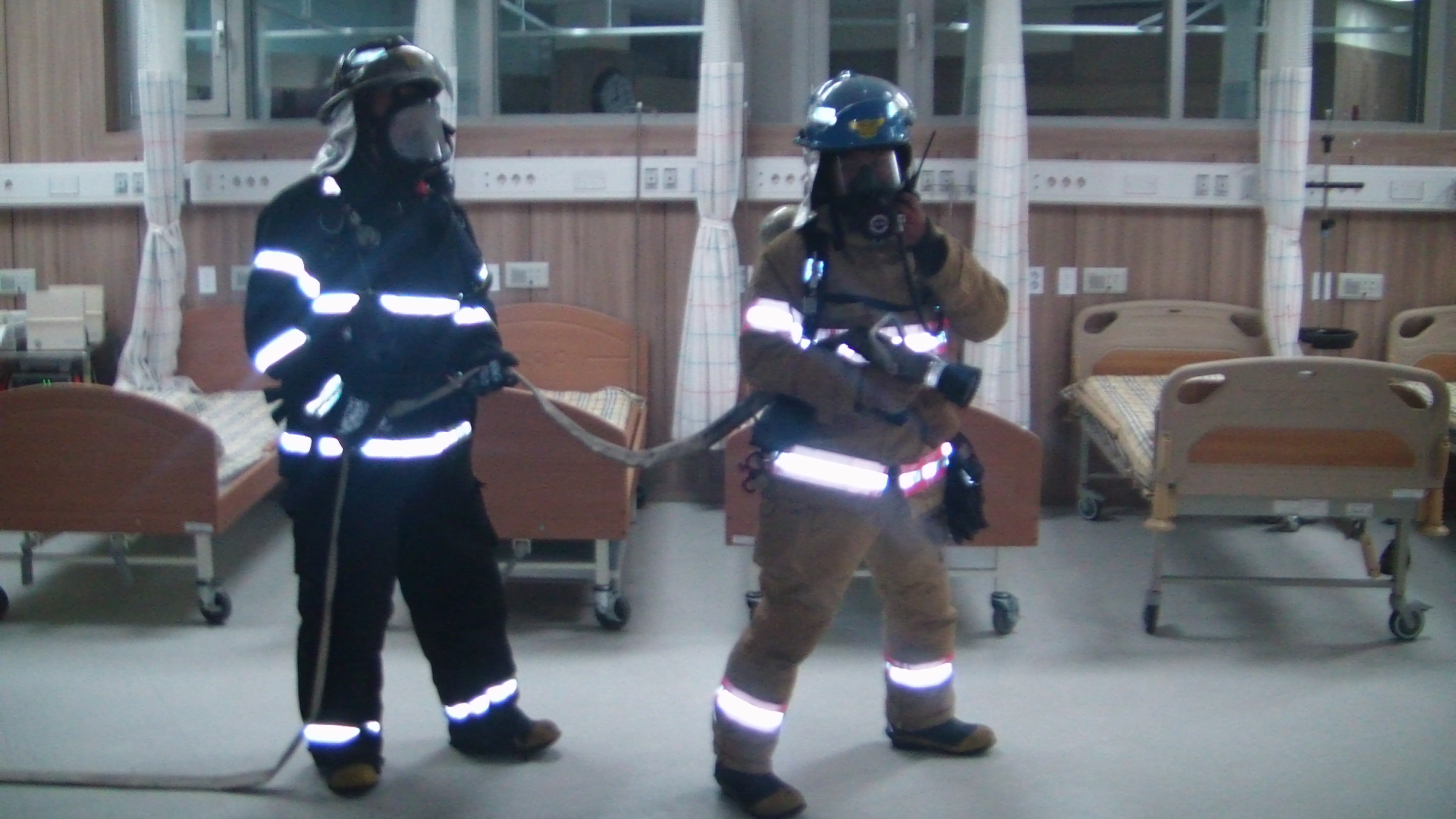 의료원 자위소방대원과 소화, 대피 및 유도, 화재통보 요령에 대해 중점을 두고 훈련했습니다.