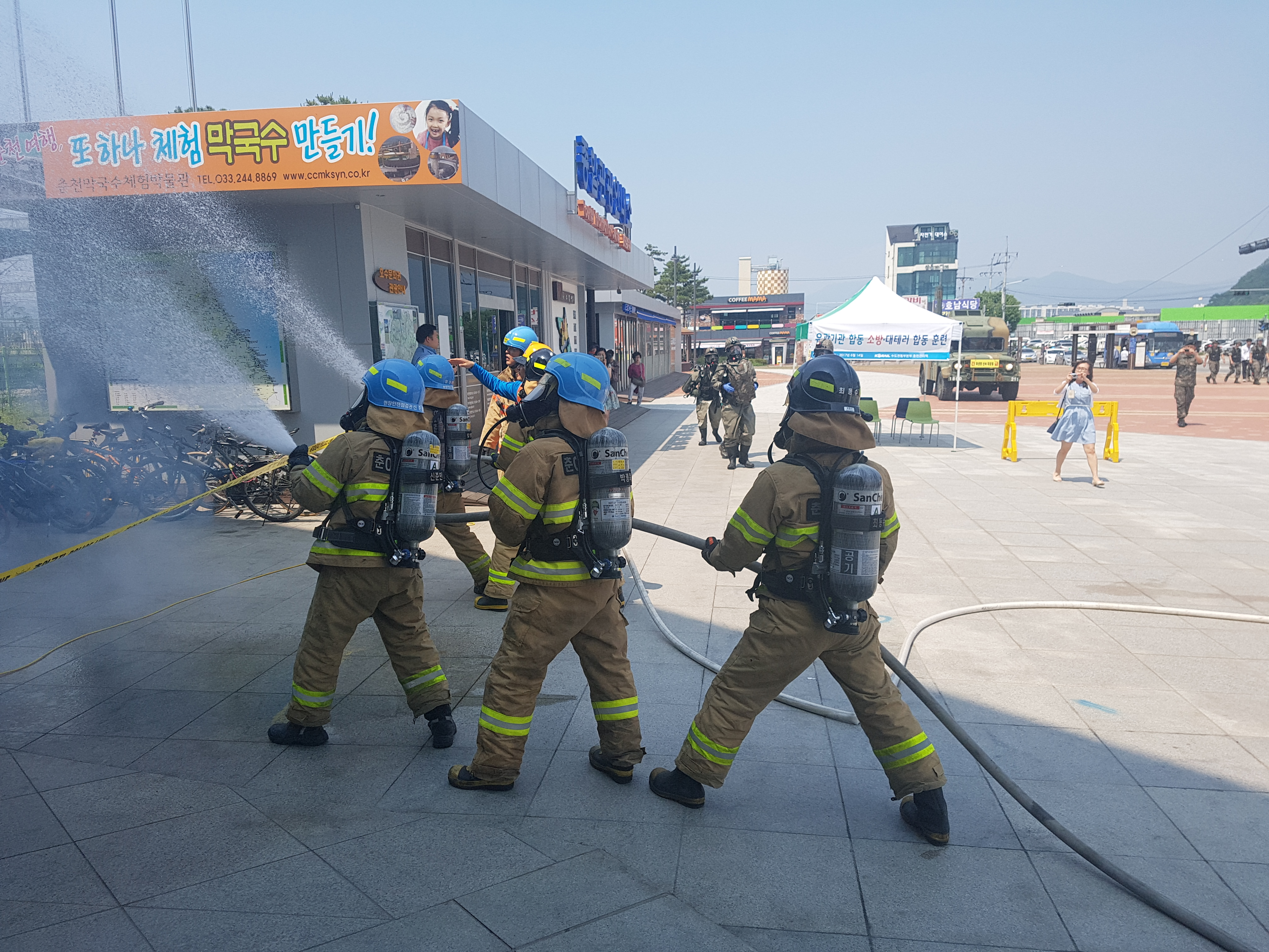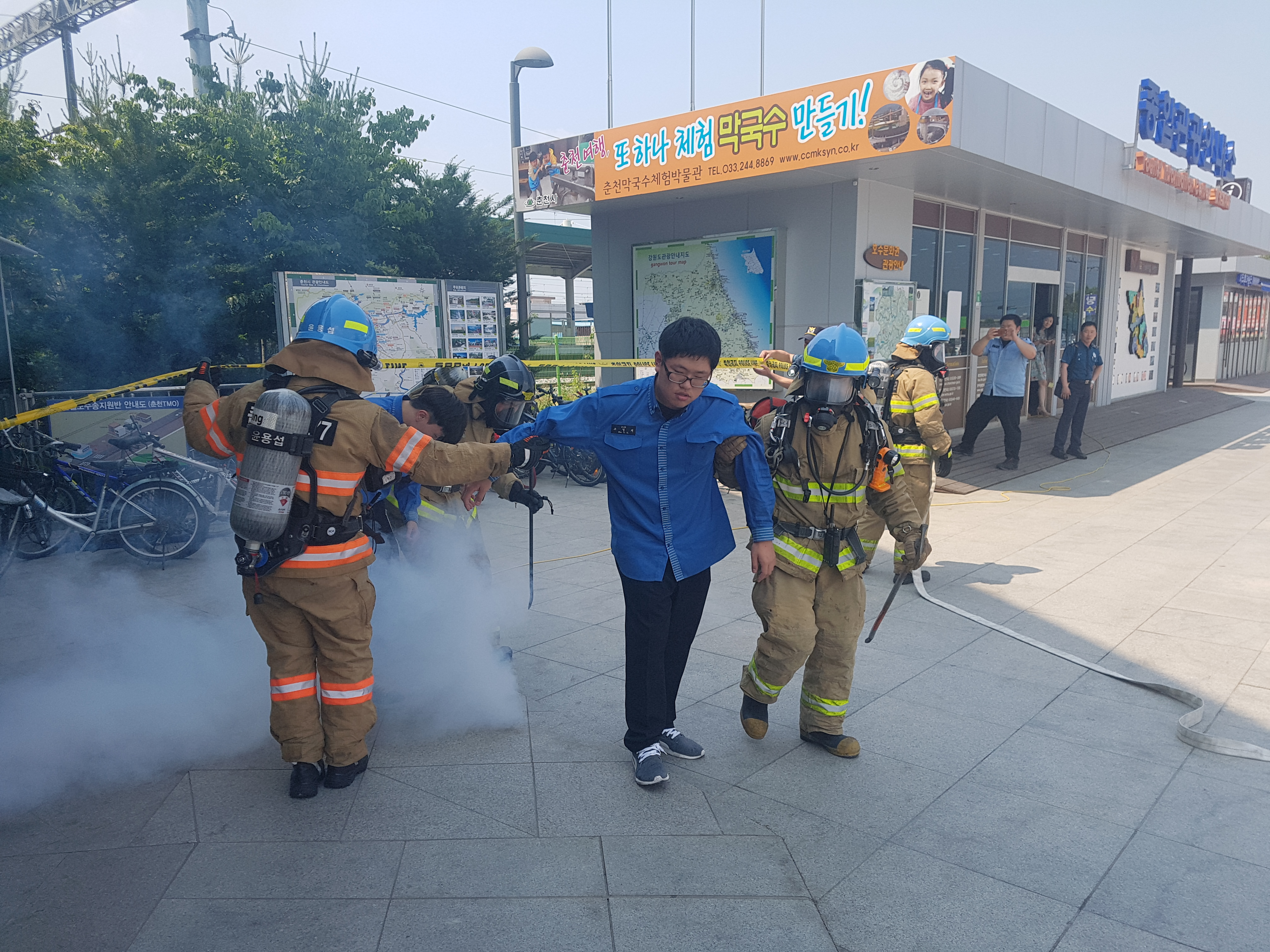 춘천소방서(서장 안중석)는 14일 오후 2시 춘천역에서 춘천경찰서, 302경비연대, 15관리대대, 12화생방대대, 춘천역관계자 등 인원 51명이 참여한 가운데 테러로 의심되는 화재상황을 부여하여 자위소방대 초기대응및 유관기관과의 화재진압능력을 배양을 위한 테러 대응 합동훈련을 실시했다.