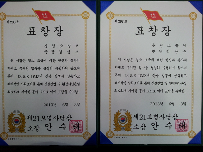 | 2568 | DMZ 화재진압 유공 사단장 표창 | 양구119안전센터 | 2013-06-13 | 1814 | |