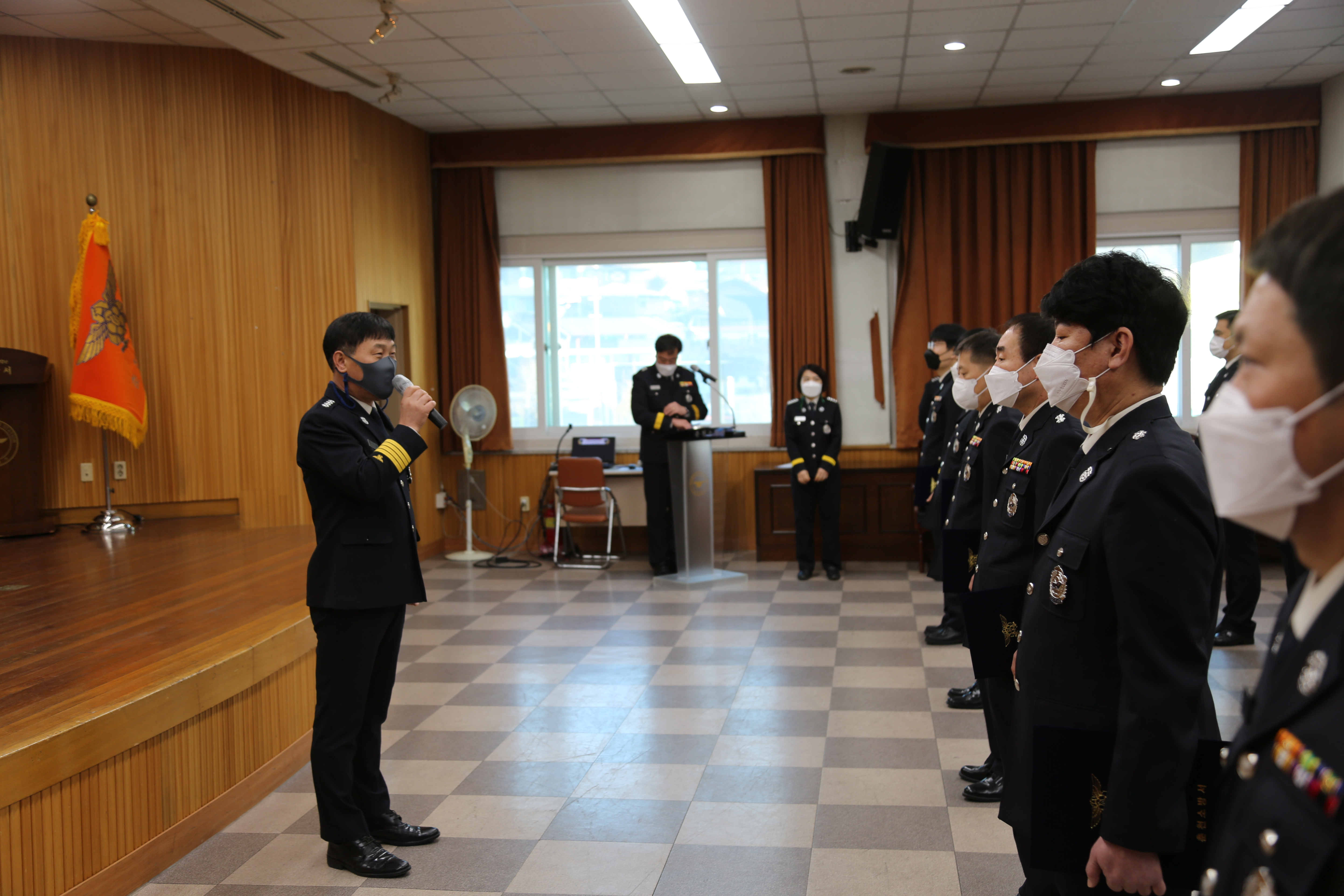 ○ 이날 신고식은 승진자⋅전입자 30명을 대상으로 실시했으며, 코로나19확산 방지를 위해 마스크 착용과 손 소독 등 방역수칙을 준수하며 진행됐다.