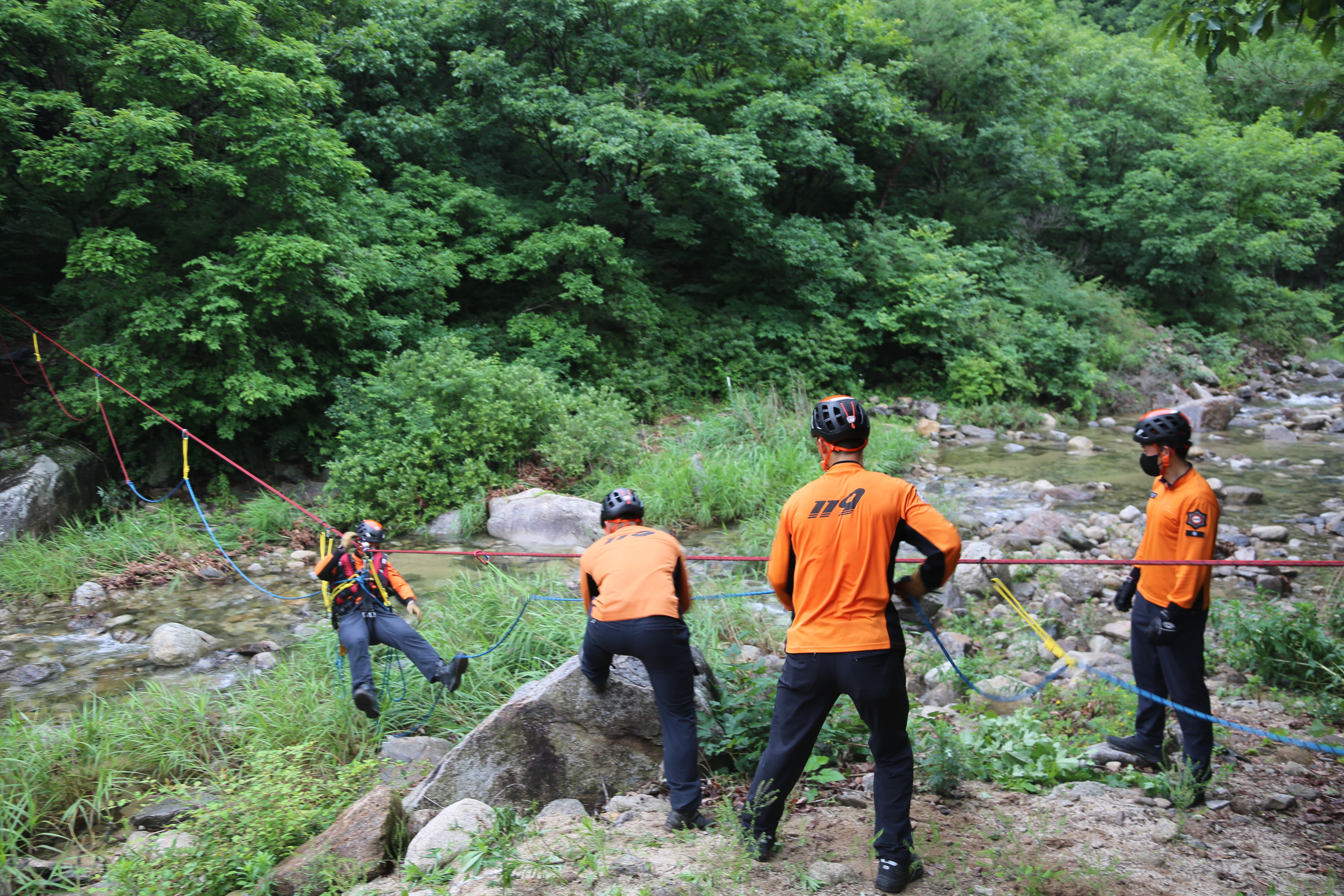 ○ 훈련내용은 ▲ 계곡 도하 훈련 ▲ 응급처치교육 ▲ 로프총 등 투척장비 숙달 훈련 등으로 진행됐다.