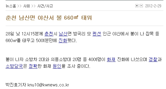 <강원일보> 춘천 남산면 야산서 불 660㎡ 태워
