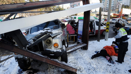 ◇지난 8일 오후 3시께 춘천시 후평동 부안주유소 앞에서 레토나 승용차가 눈길에 미끄러지면서 시내버스정류장을 들이받았다. 이 사고로 버스를 기다리던 김모(69·여)씨 등 3명이 다쳐 119구조대에 의해 병원으로 긴급 후송되고 있다