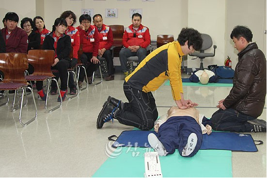 이번 경연대회는 5개팀 25명으로 구성이 된 롯데마트 자위소방대를 대상으로 심폐소생술 및 소방상식 OX퀴즈 2종목으로 진행되었으며 대회를 마친뒤 화재예방 및 소방시설 사용방법, 심폐소생술 교육을 실시했다. (사진=춘천소방서 제공)