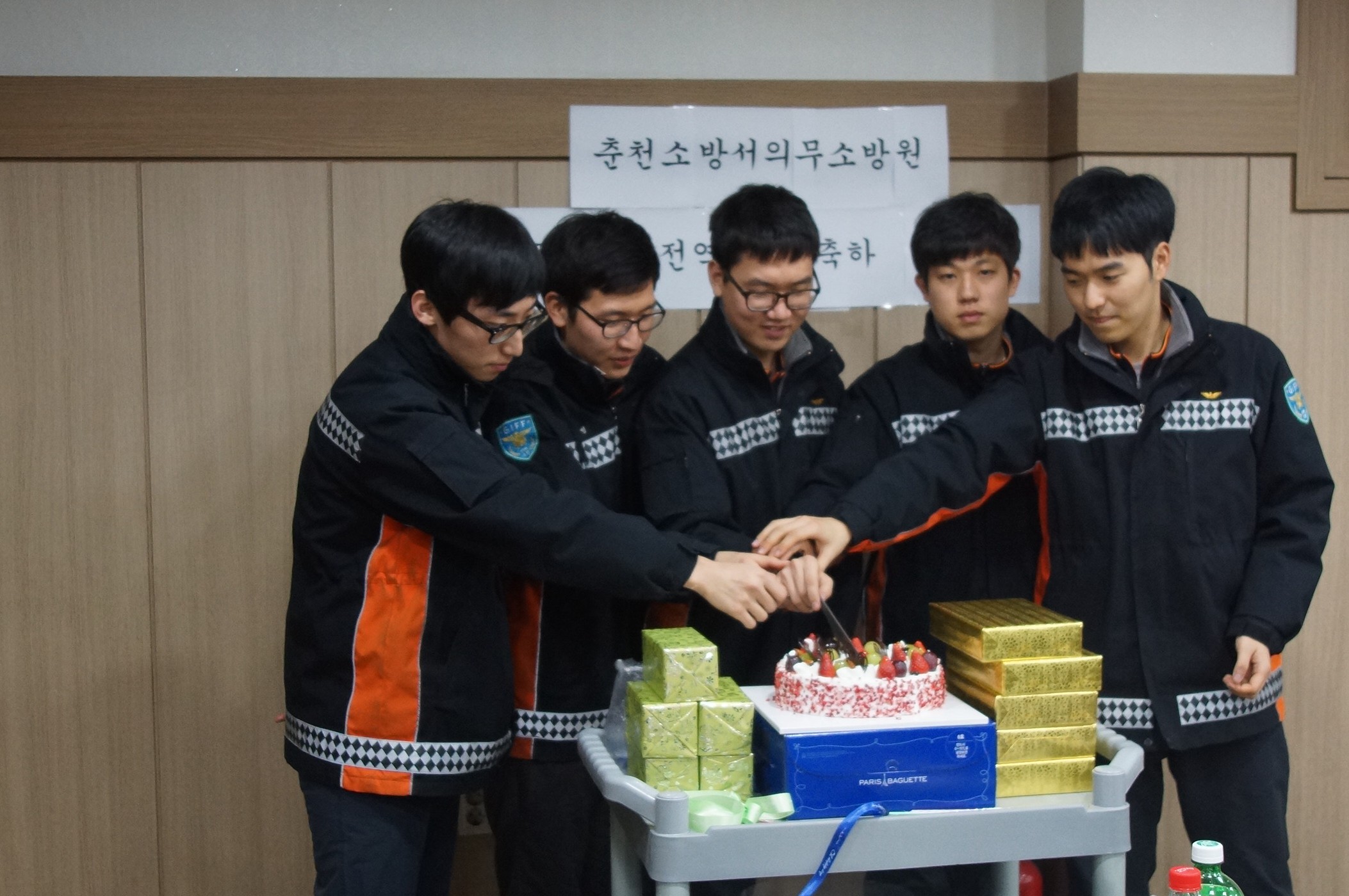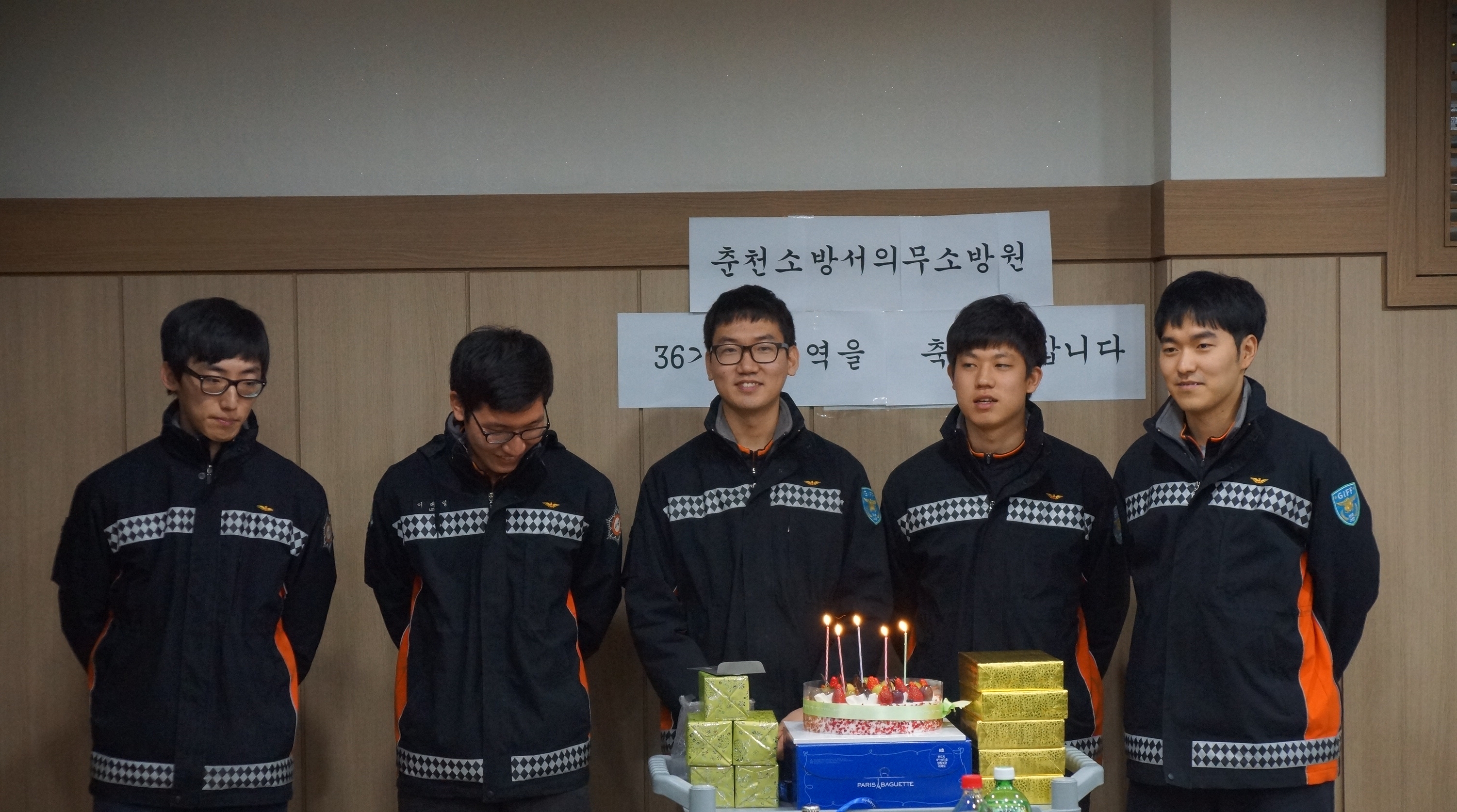 지난 2012년 5월4일부터 근무를 시작해 2014년 2월7일 전역을 코앞에 둔 36기 의무소방원들에게 춘천소방서에서는 작게나마 2월5일 저녁에 전역기념파티를 마련해주었습니다.