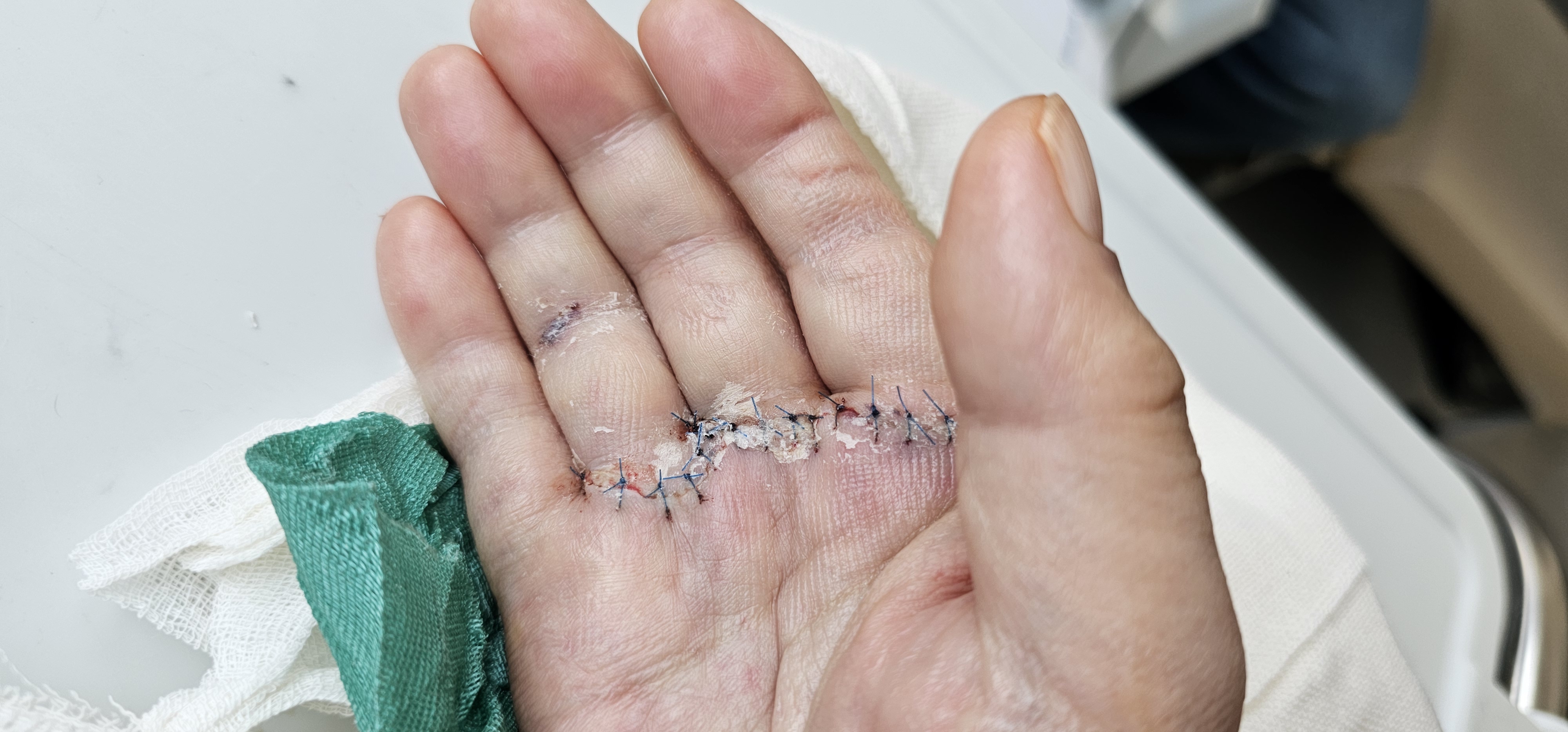 다행히 골절이나 인대 절단 등 큰 문제는 없었고 당일 수술을 받을 수 있었습니다. 오른손 손바닥과 손가락 주위로 15바늘 정도 봉합 수술을 받고 12일날 무사히 퇴원하셨습니다.