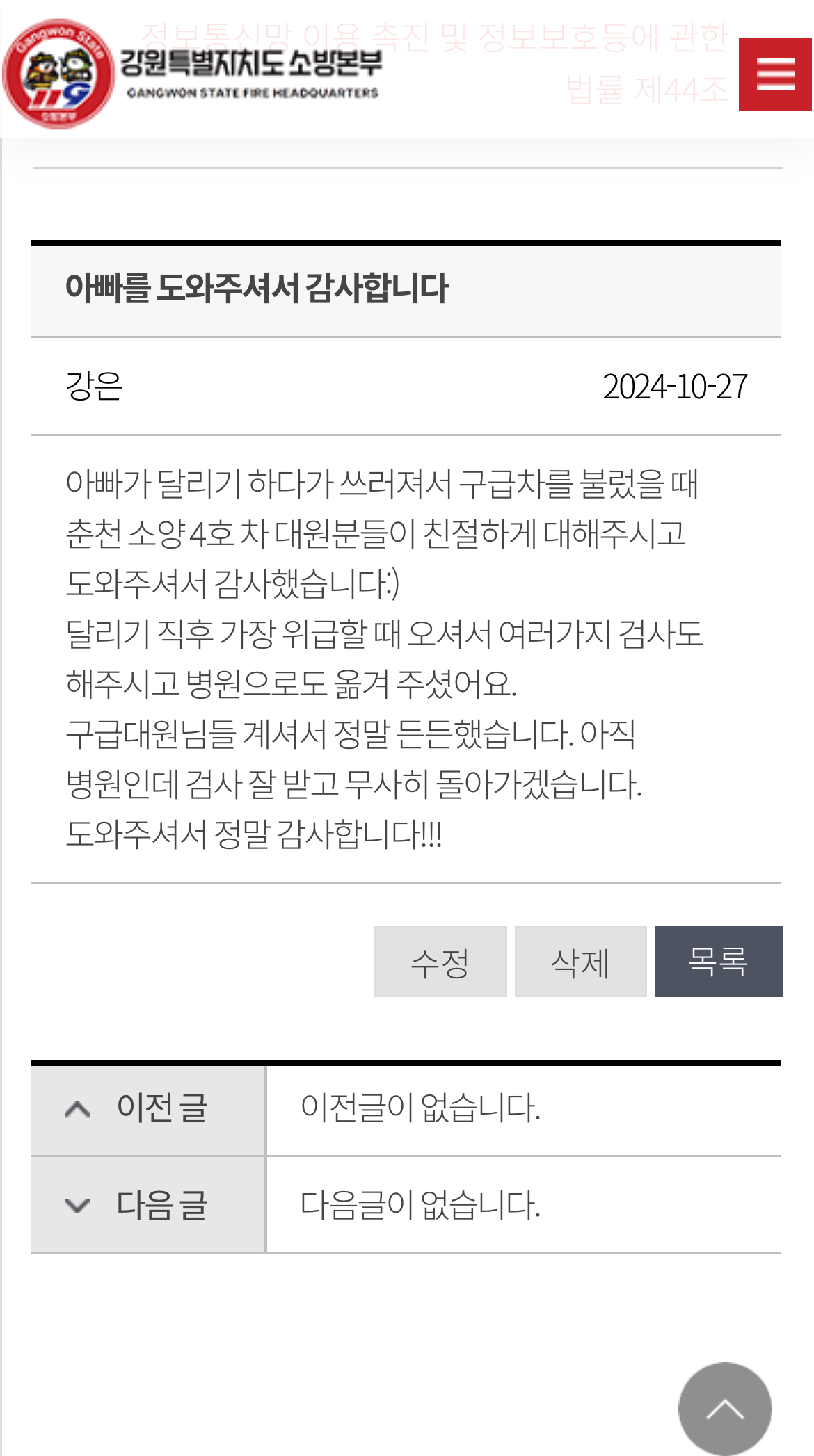 감사인사 드립니다. 작년에 강원소방본부에 글을 써서 전달이 되었을지 몰라 다시 남깁니다. 새해 복 많이 받으시고 늘 건강하세요~!!