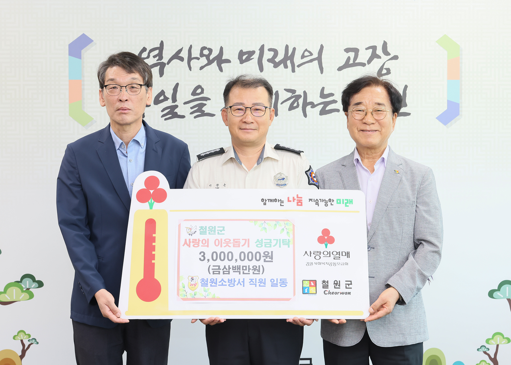 전달된 성금은 철원소방서 직원모임 119사랑나눔회에 전 직원이 매달 3,000원씩 낸 금액으로 마련됐다.