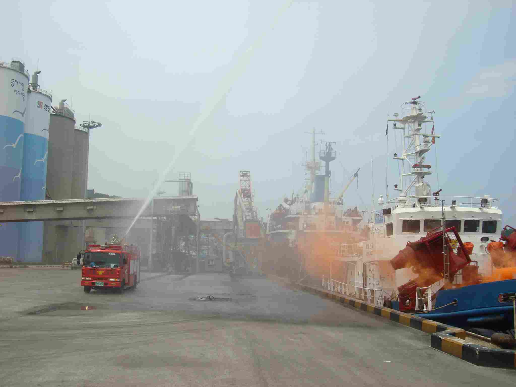 이날 훈련은 테러에 의한 정박 화물선 방화 및 폭파에 따른 화재진압 훈련을 실시하였습니다.