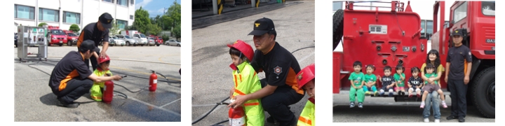 어린이들은 119신고 체험 과 화재 예방 및 피난요령 등을 듣고 물소화기를 체험해보는