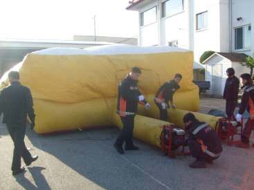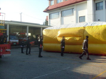 화재시 신곡하고 빠르게 에어매트를 펼칠수 있도록 만전을 기하고 있다.