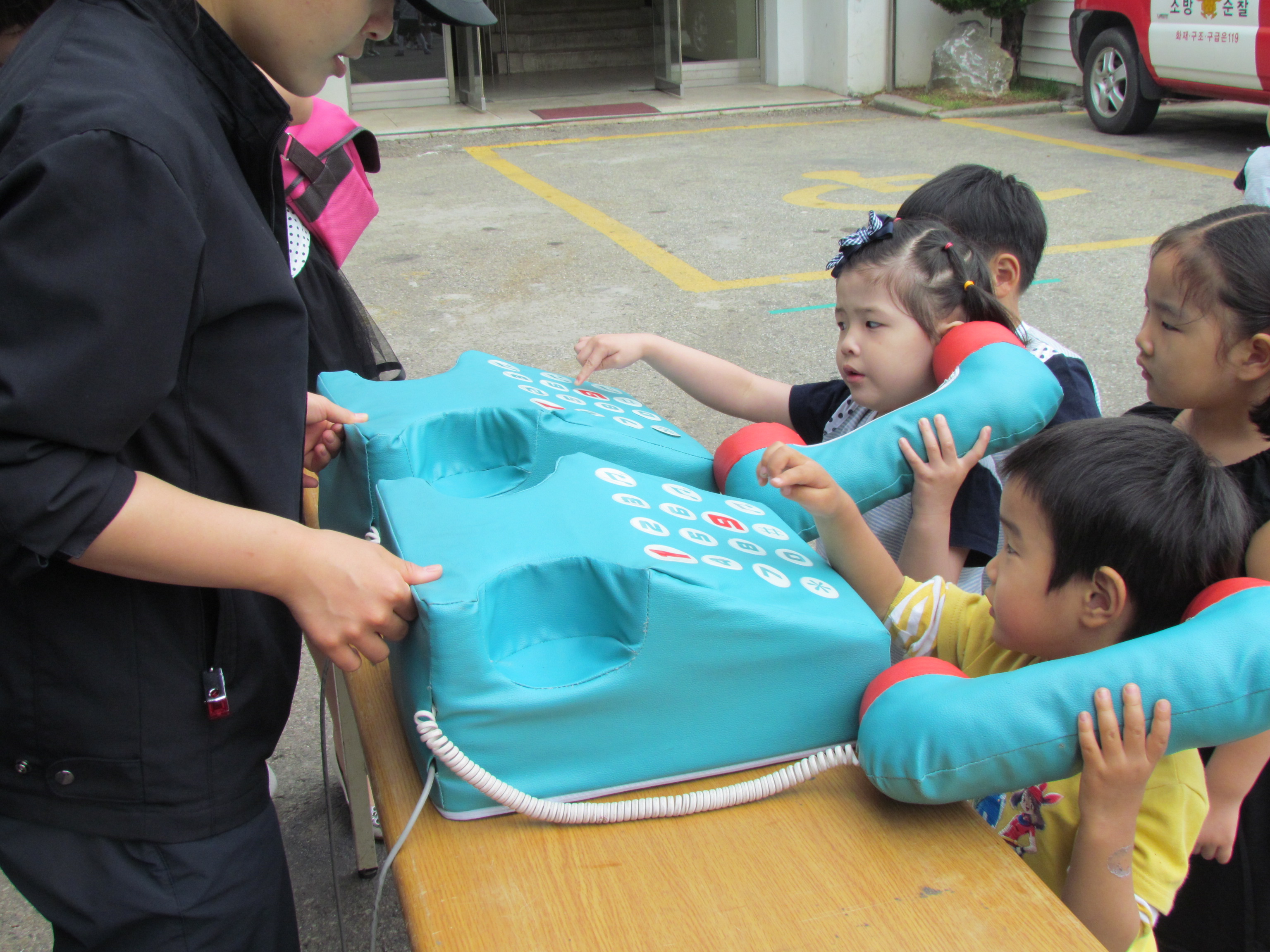 물소화기 체험장에서 소화기 사용법도 배우고, 119신고전화체험도 하였습니다~ 소방관 복장의 포토존에서 일일 소방관이 되어보는 유익한 시간을 가졌습니다