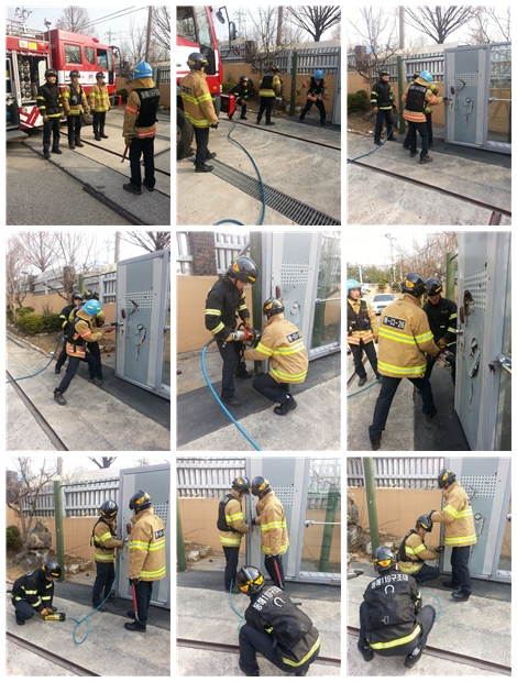 파괴훈련장 에서 유압장비 조작훈련 및 문개방 방법등을 숙달훈련 하였다.