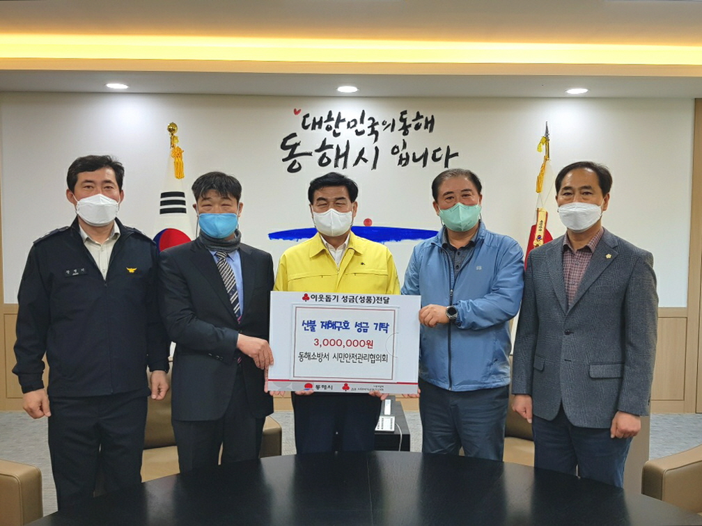 동해소방서 시민안전관리협의회(회장 성재기)는 3월 15일 오전9시30분 동해시청을 방문 동해산불 관련 이재민 돕기에 써달라고“산불 재해구호 성금 3,000,000원”을 전달하였다.