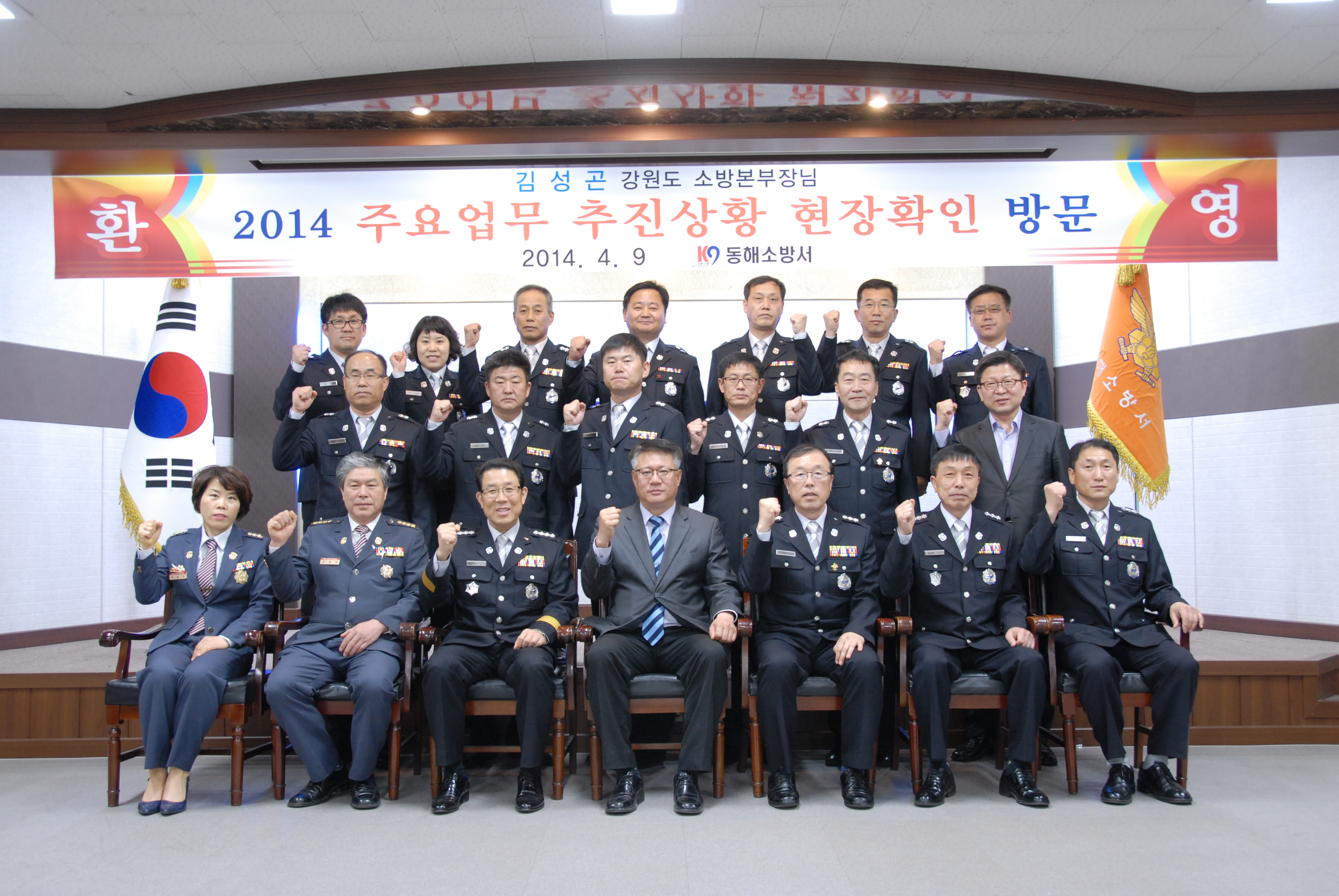 김성곤 강원소방본부장이 4월9일 오후 1시 동해소방서를 방문해 주항중 동해소방서장으로부터 2014년도 주요현안업무 추진상황 및 애로사항을 듣고, 삼화사를 방문해 산불대응대책 브리핑 청취 및 현장 확인점검하고 봄철 산불예방에 주력을 다할 것을 당부하였습니다.