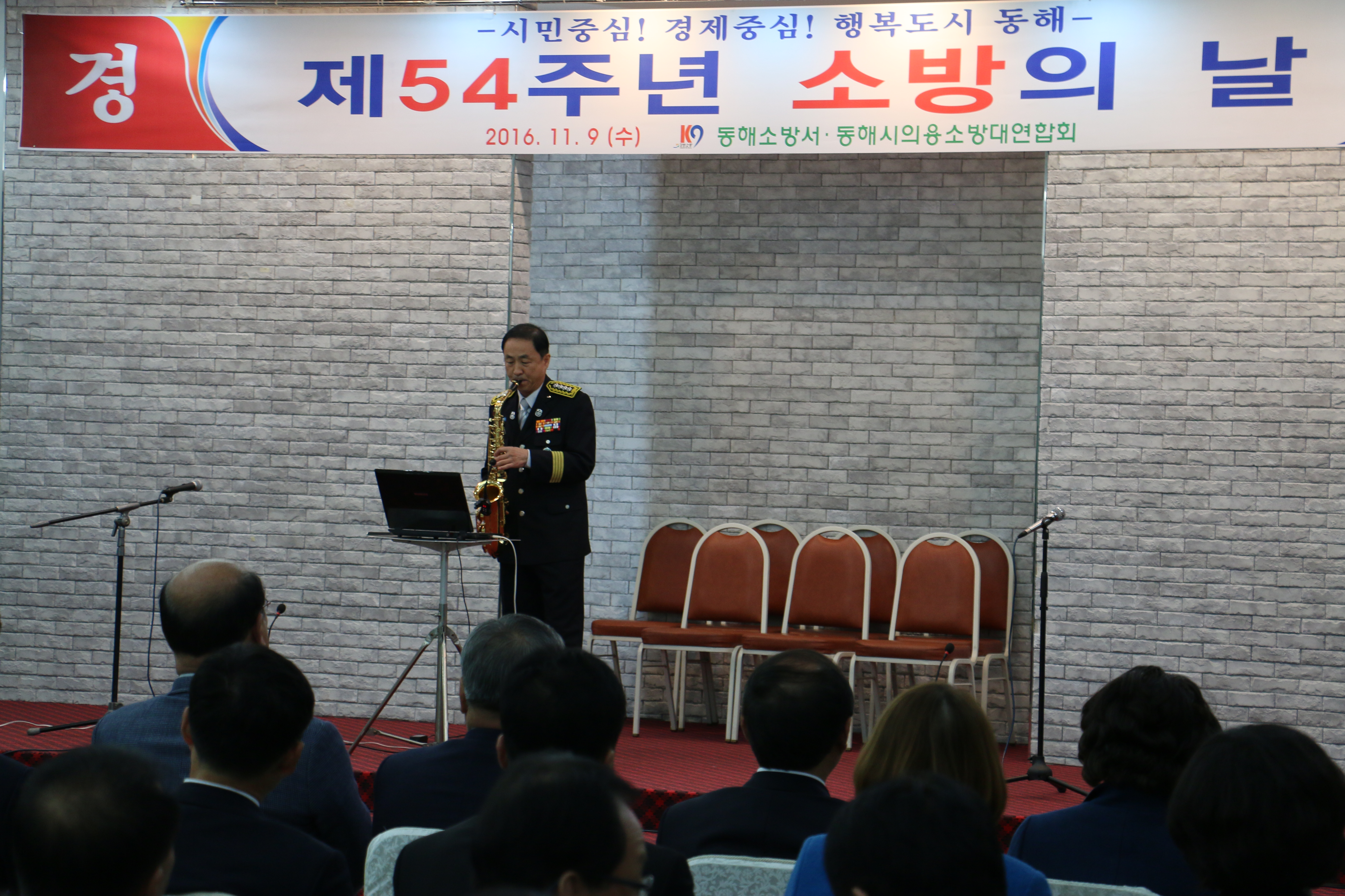 동해소방서(서장 김영조)는 9일(수) 오전 11시 해군회관에서“제54주년 소방의 날을 맞아 동해시장, 도의원, 시의원, 퇴직소방공무원 등 내‧외 귀빈과 소방공무원 및 의용소방대 230명이 참여한 가운데 기념식을 가졌다.