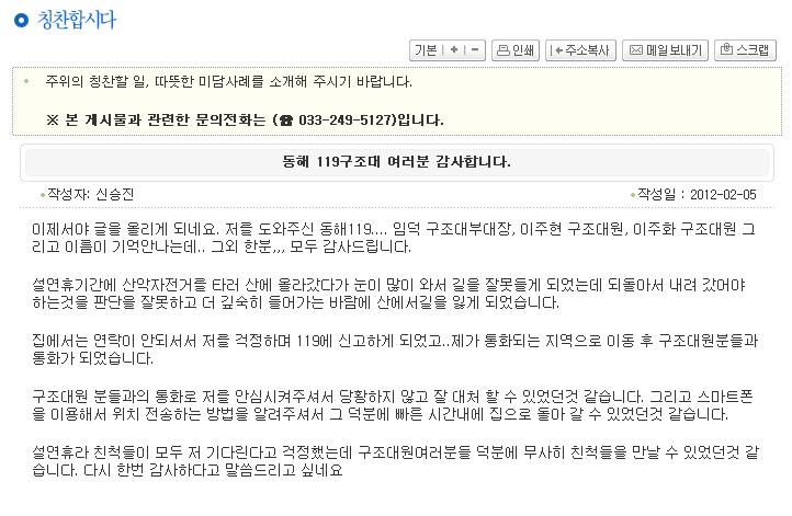 강원도소방본부 "칭찬합시다" 에 게재된 글을 소개합니다!!!