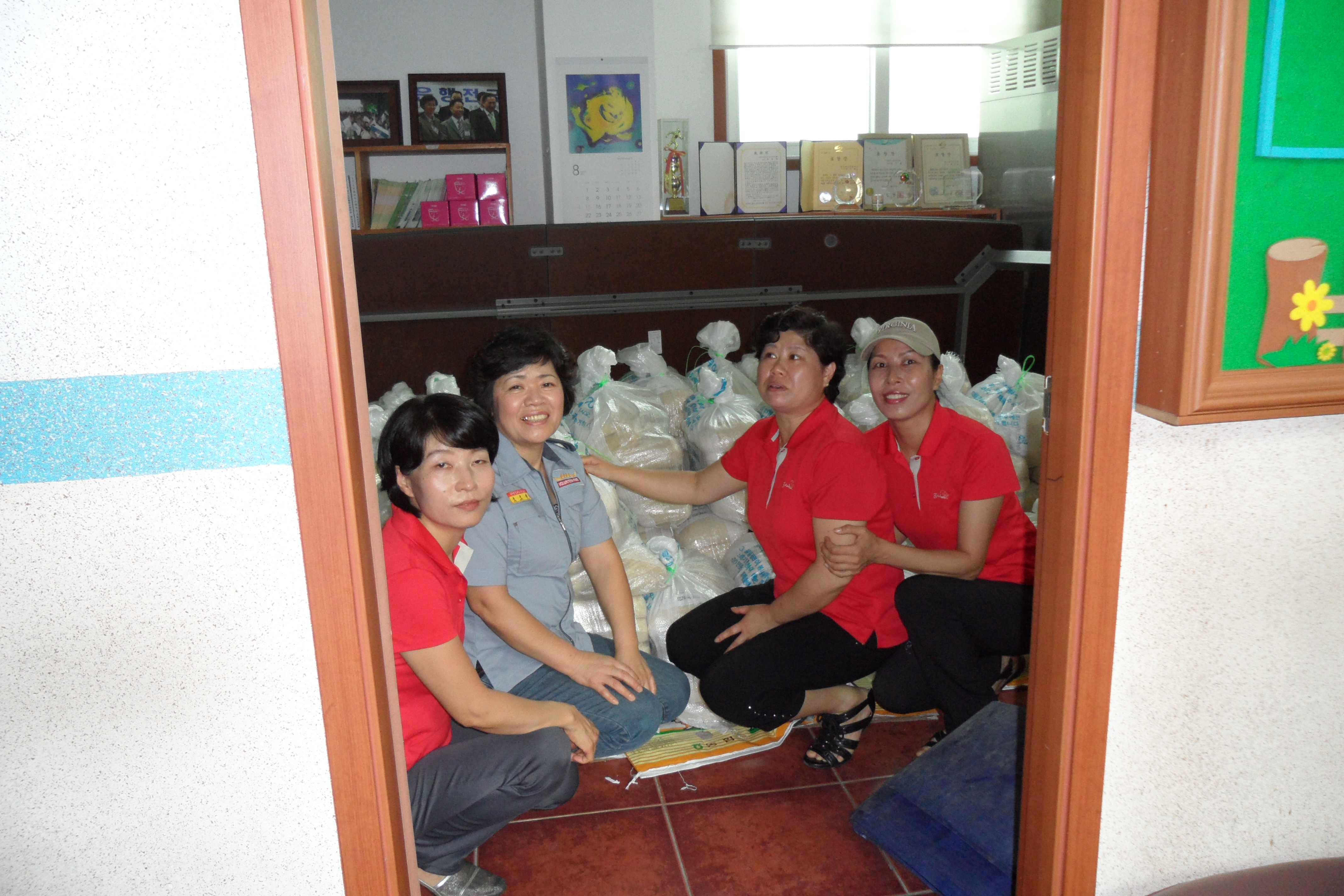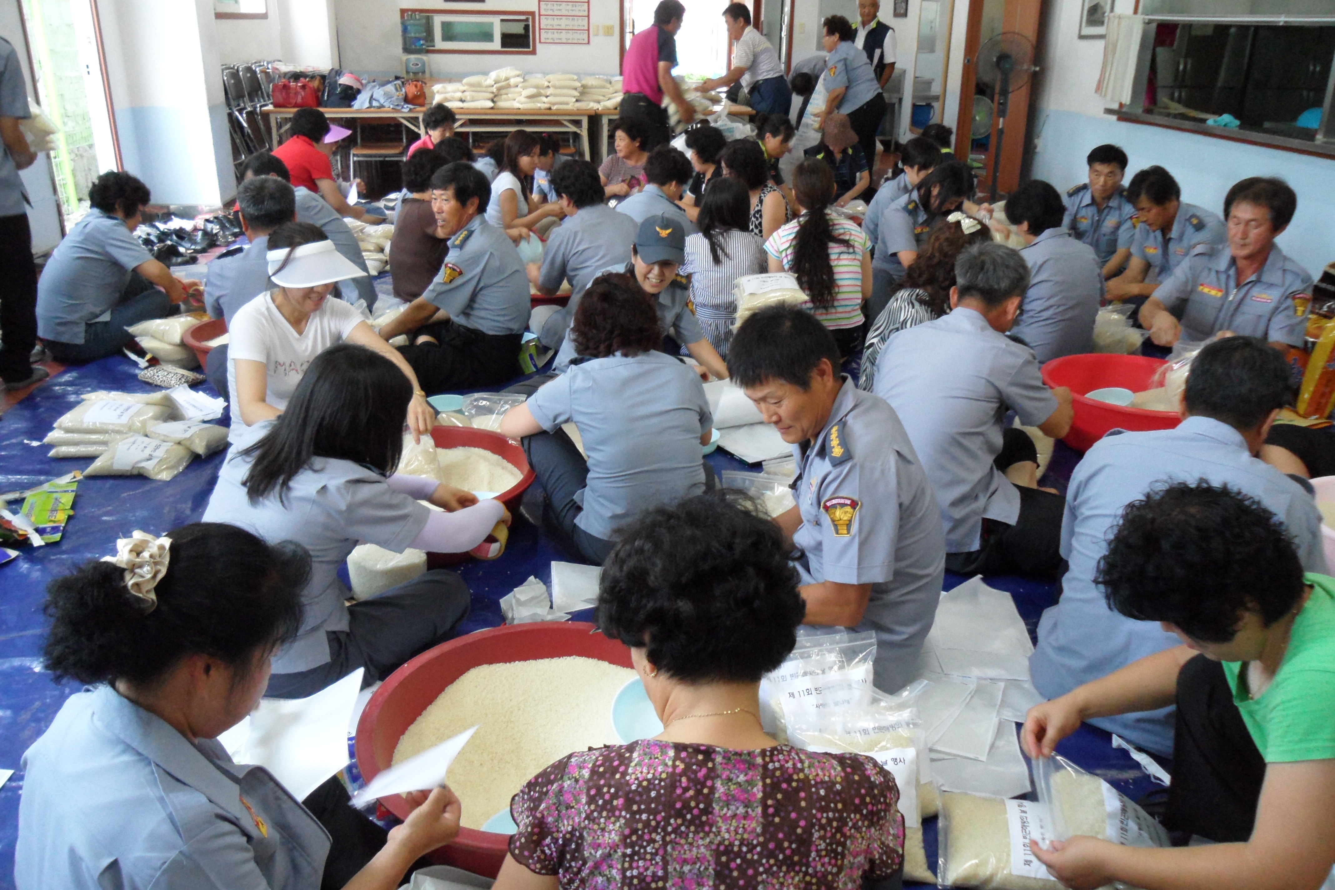 따라서 그 날 행사에 사용될 사랑의 쌀 소포장 작업을 하였는데 흥업남.여의용소방대를 비롯하여 각 대에서 3명이상씩 참여하였습니다. 일손이 많으니 산더미(?!)같던 쌀포대가 순식간에 바닥이 났습니다. 인해전술(???!!!)은 아주 많이 무섭습니다......ㅎㅎ