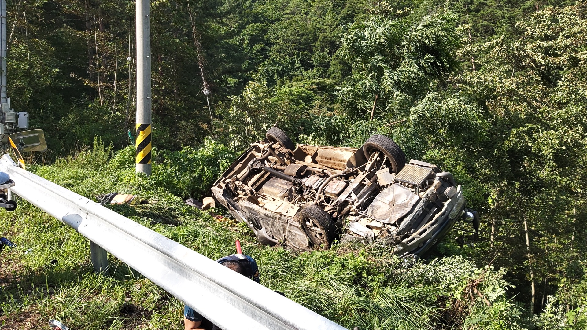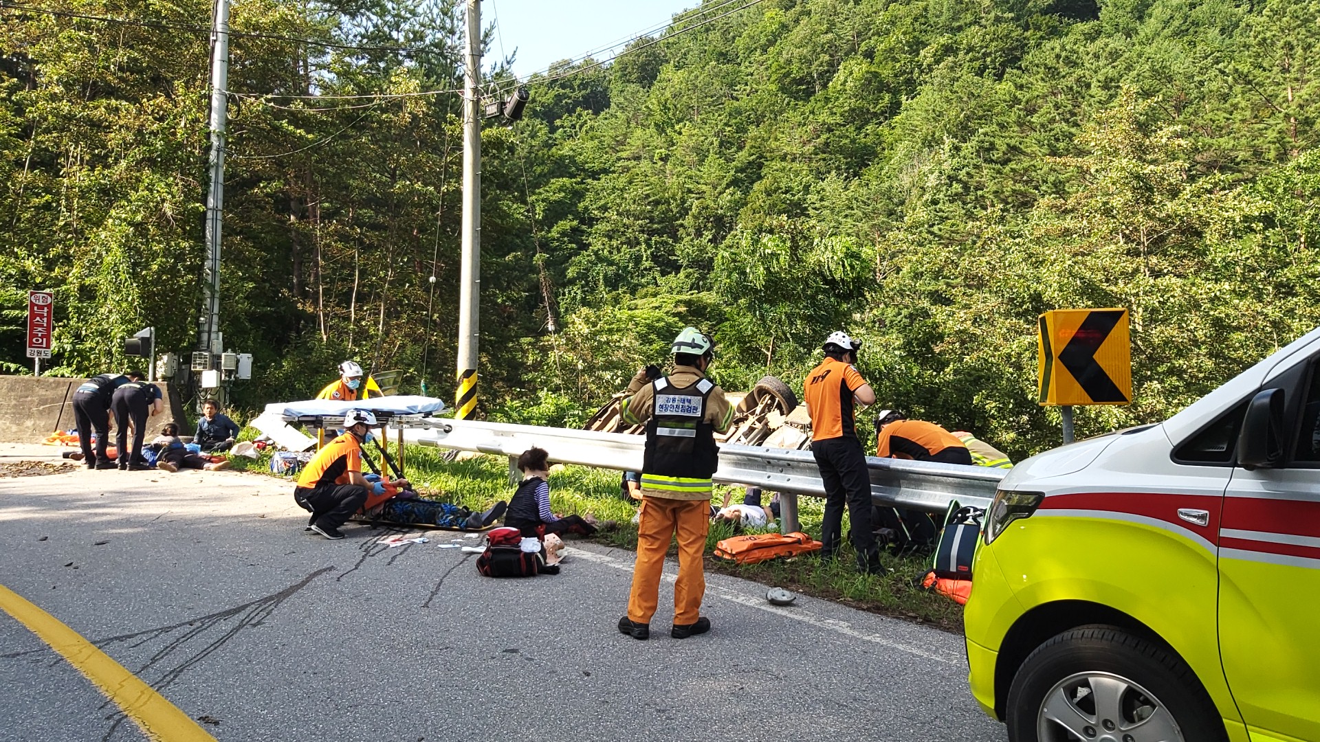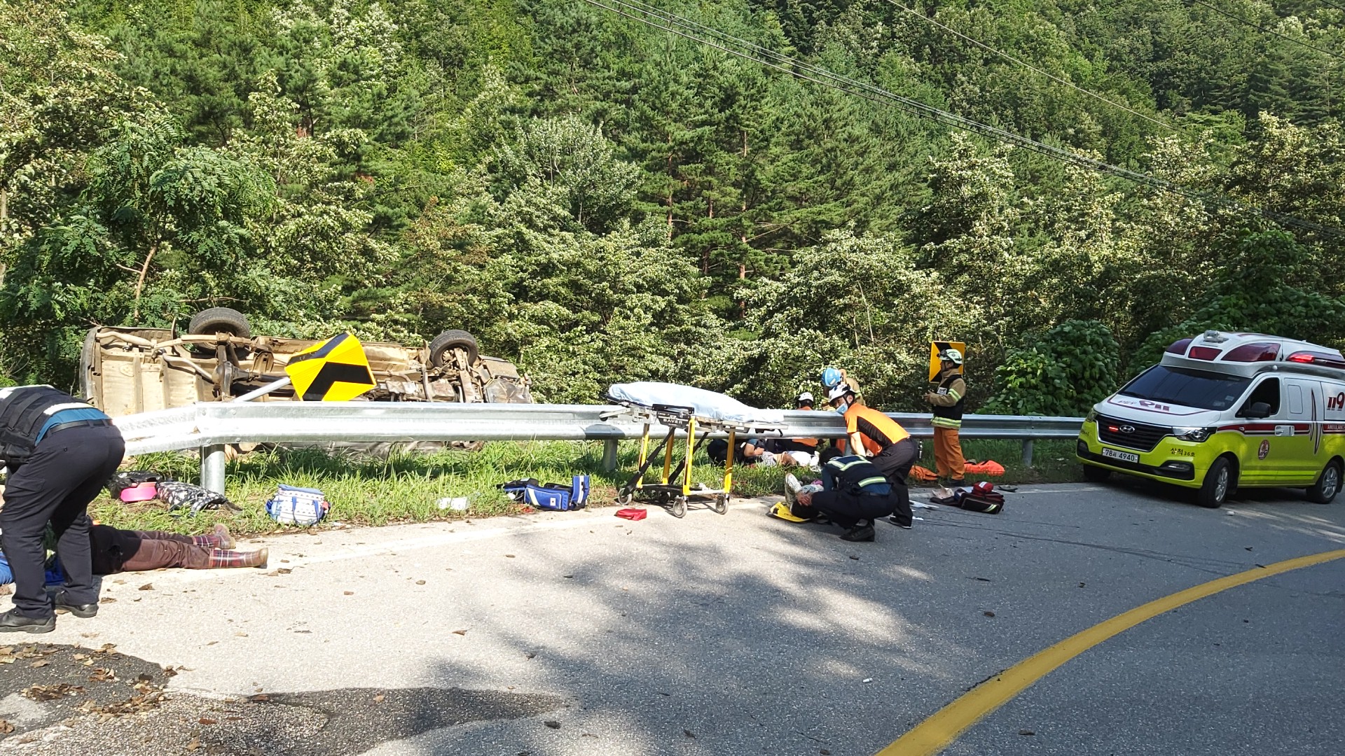승합차(그레이스) 가드레일 받으면서 도로 옆으로 전복됨, 밭으로 쪽파작업(파종작업)하러 가는 길에 사고발생