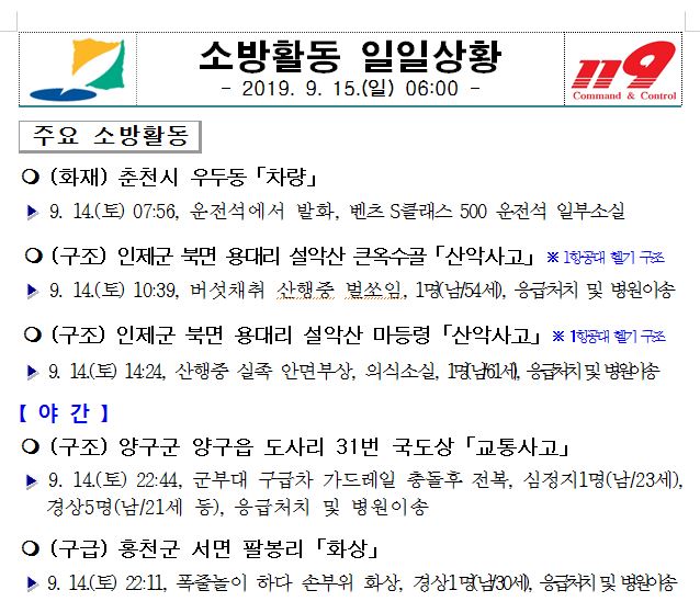 소방활동 일일상황 (9. 15. 일) 06:00