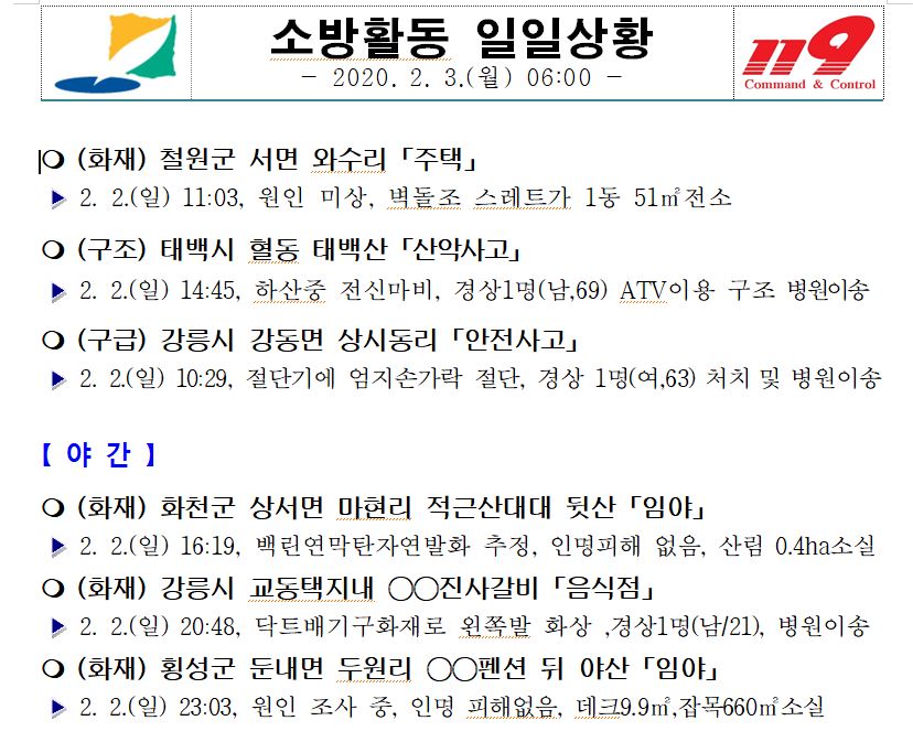 소방활동 일일상황 (2. 3. 월) 06:00