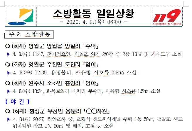 소방활동 일일상황 (4. 9. 목) 06:00