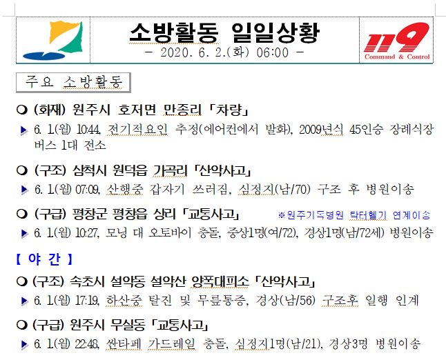 소방활동 일일상황 (6. 2. 화) 06:00