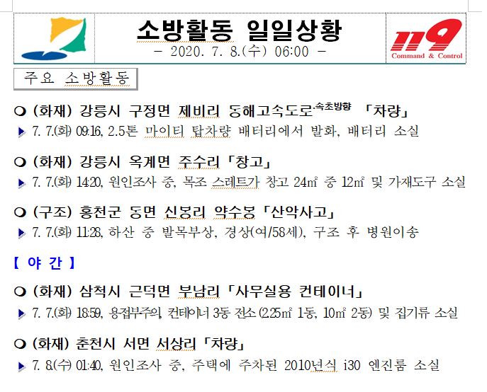 소방활동 일일상황 (7. 8. 수) 06:00