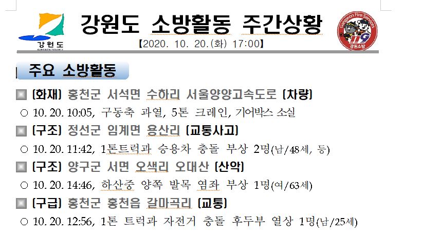 강원도 소방활동 주간상황(10. 20. 화) 17:00