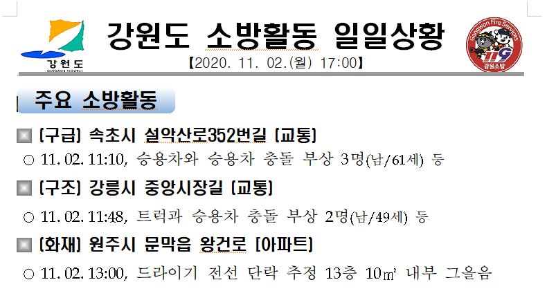 강원도 소방활동 주간상황(11. 2.월) 17:00