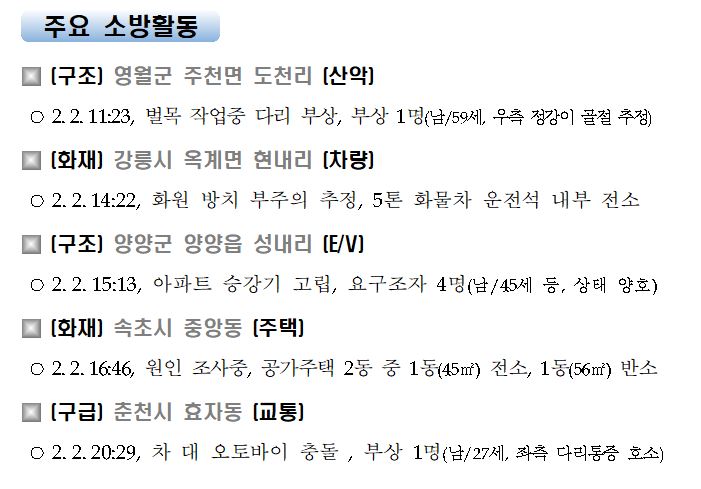 강원도 소방활동 주간상황(2. 2. 화) 17:00