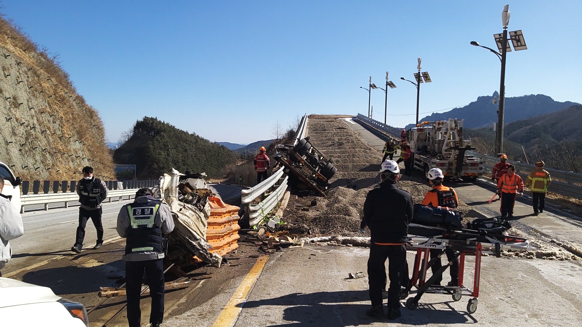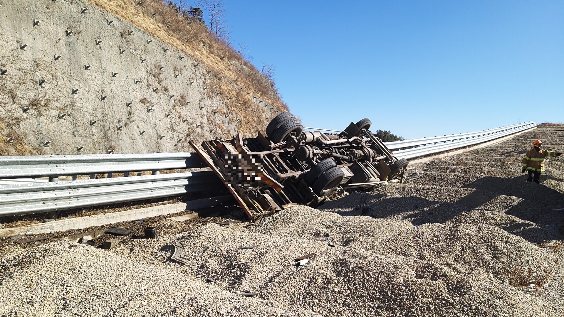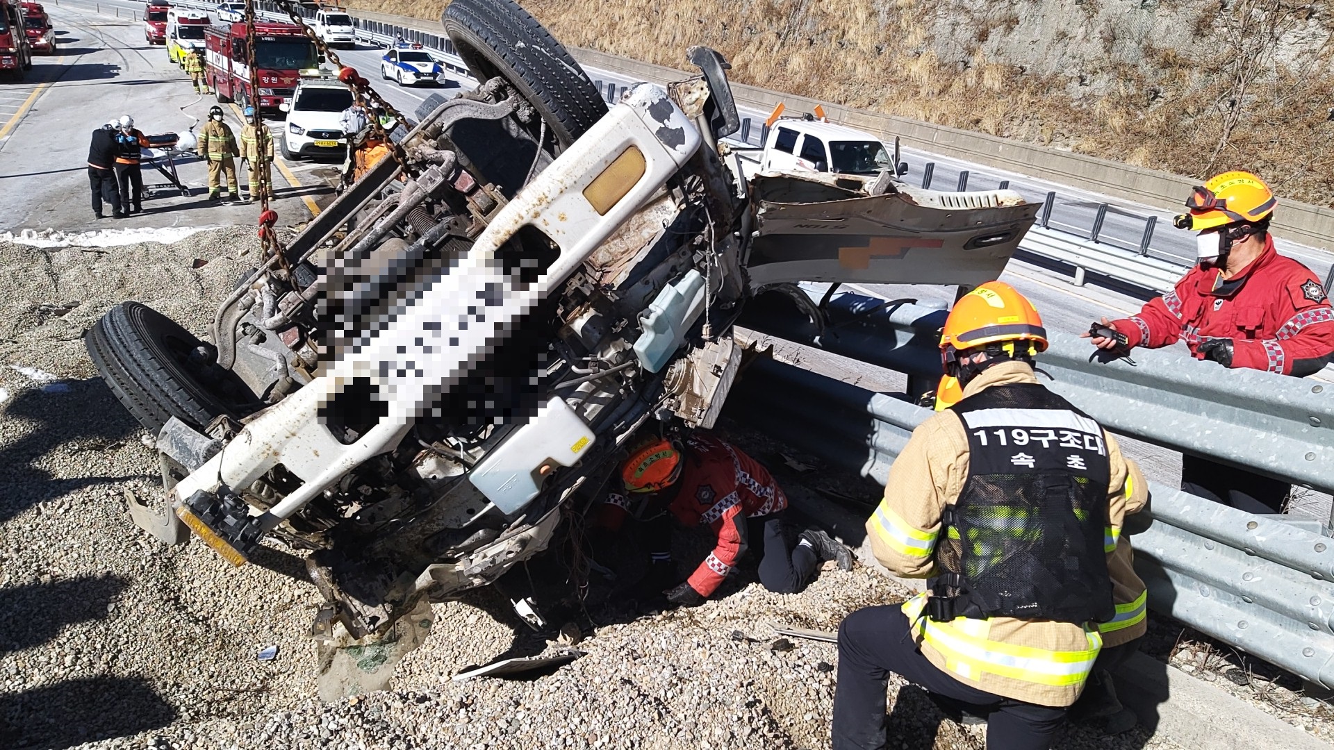 3. 내용 : 화물차량이 속초방향 미시령터널 지난 후 내려막길 차량제동시설로 진입중 전복된 사고