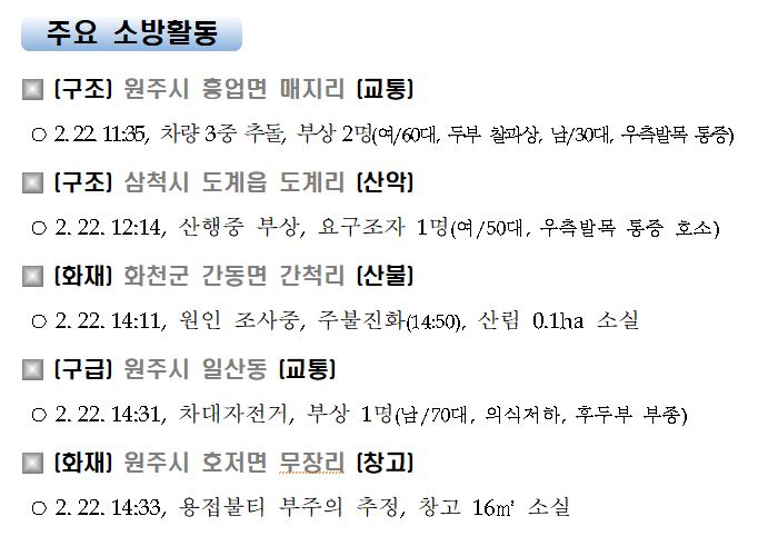 강원도 소방활동 주간상황(2. 22. 월) 17:00