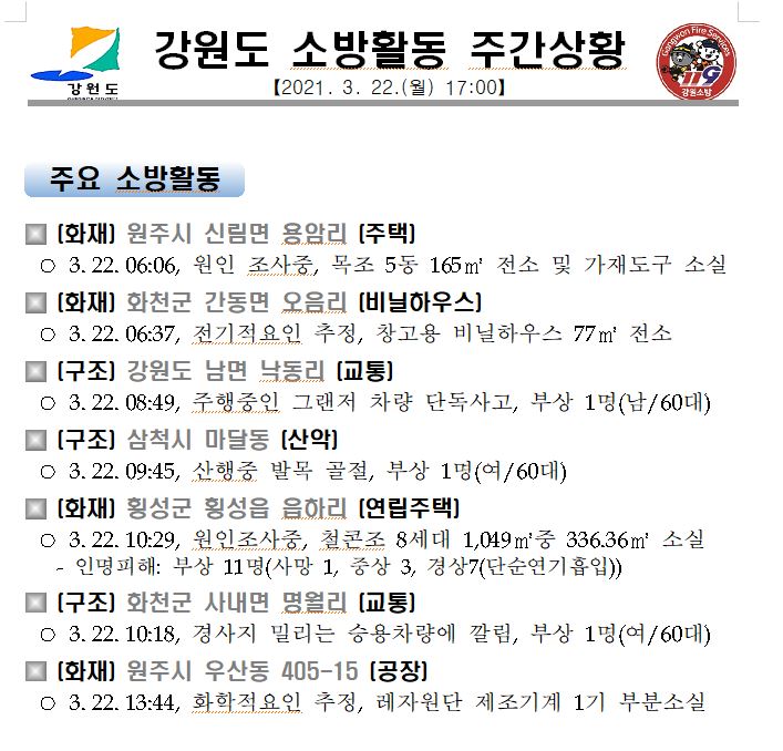 강원도 소방활동 주간상황(3. 22. 월) 17:00
