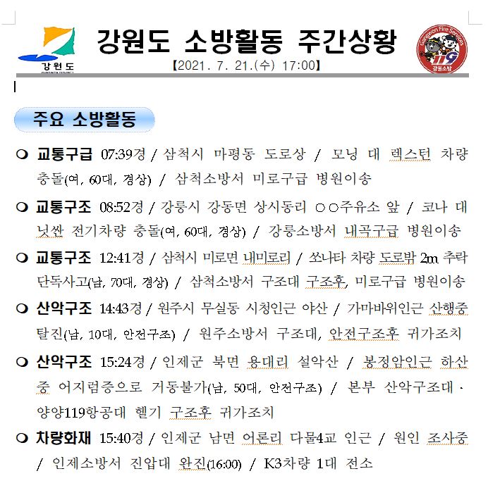 강원도 소방활동 주간상황 (7. 21. 수) 17:00