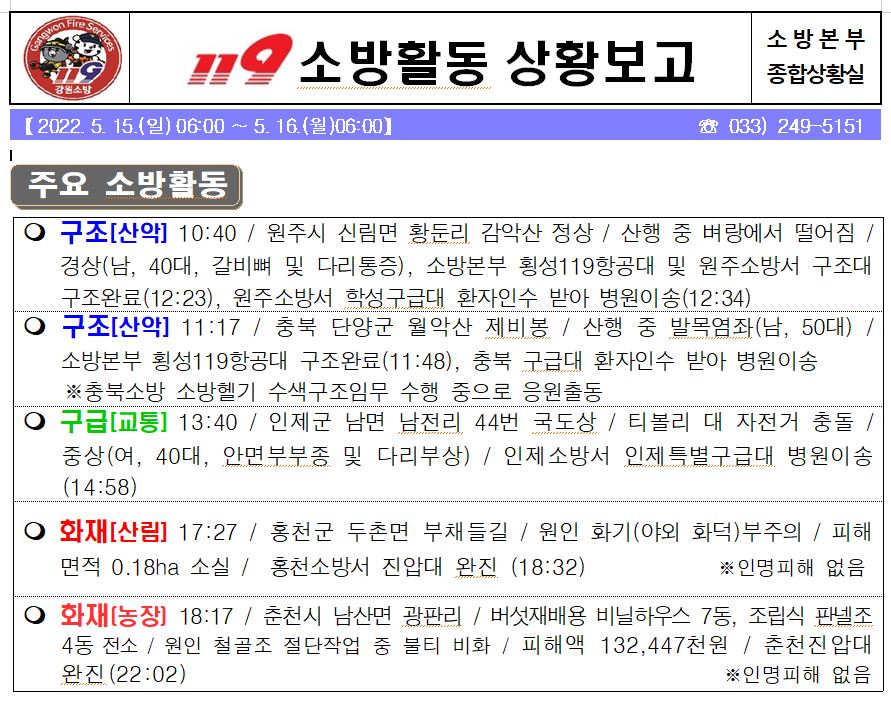 119 소방활동 상황보고(5. 16. 월) 06:00