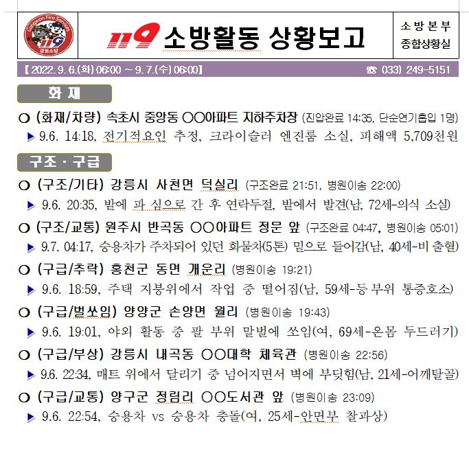 119 소방활동 상황보고(9. 7. 수) 06:00