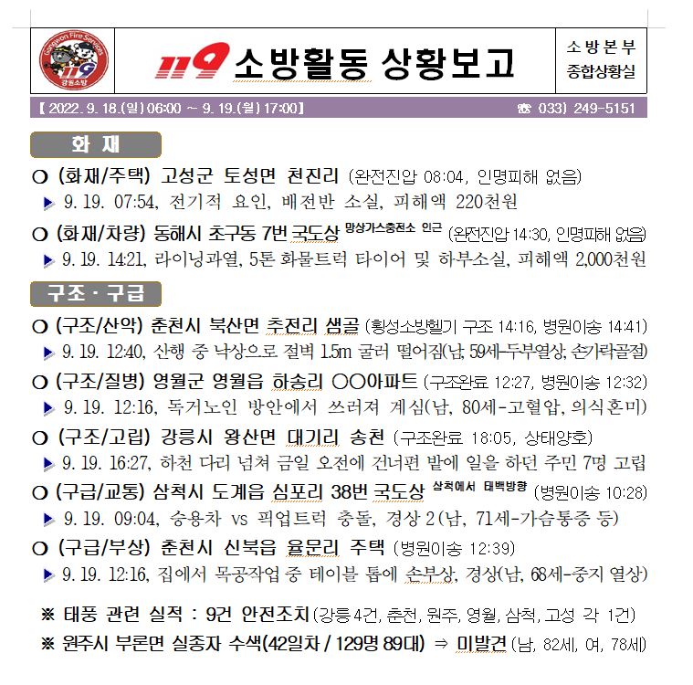 119 소방활동 상황보고(9. 19. 월) 06:00 - 사진 추가