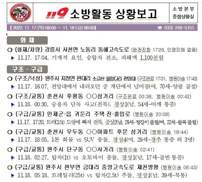 119 소방활동 상황보고(11. 18. 금) 06:00