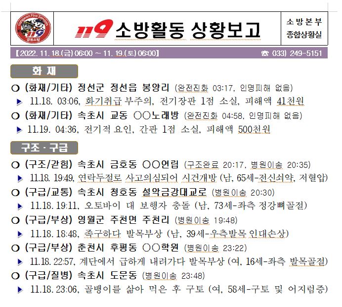 119 소방활동 상황보고(11. 19. 토) 06:00