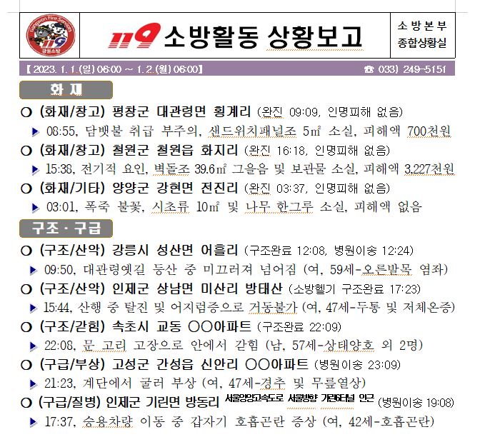 119 소방활동 상황보고(1. 2. 월) 06:00