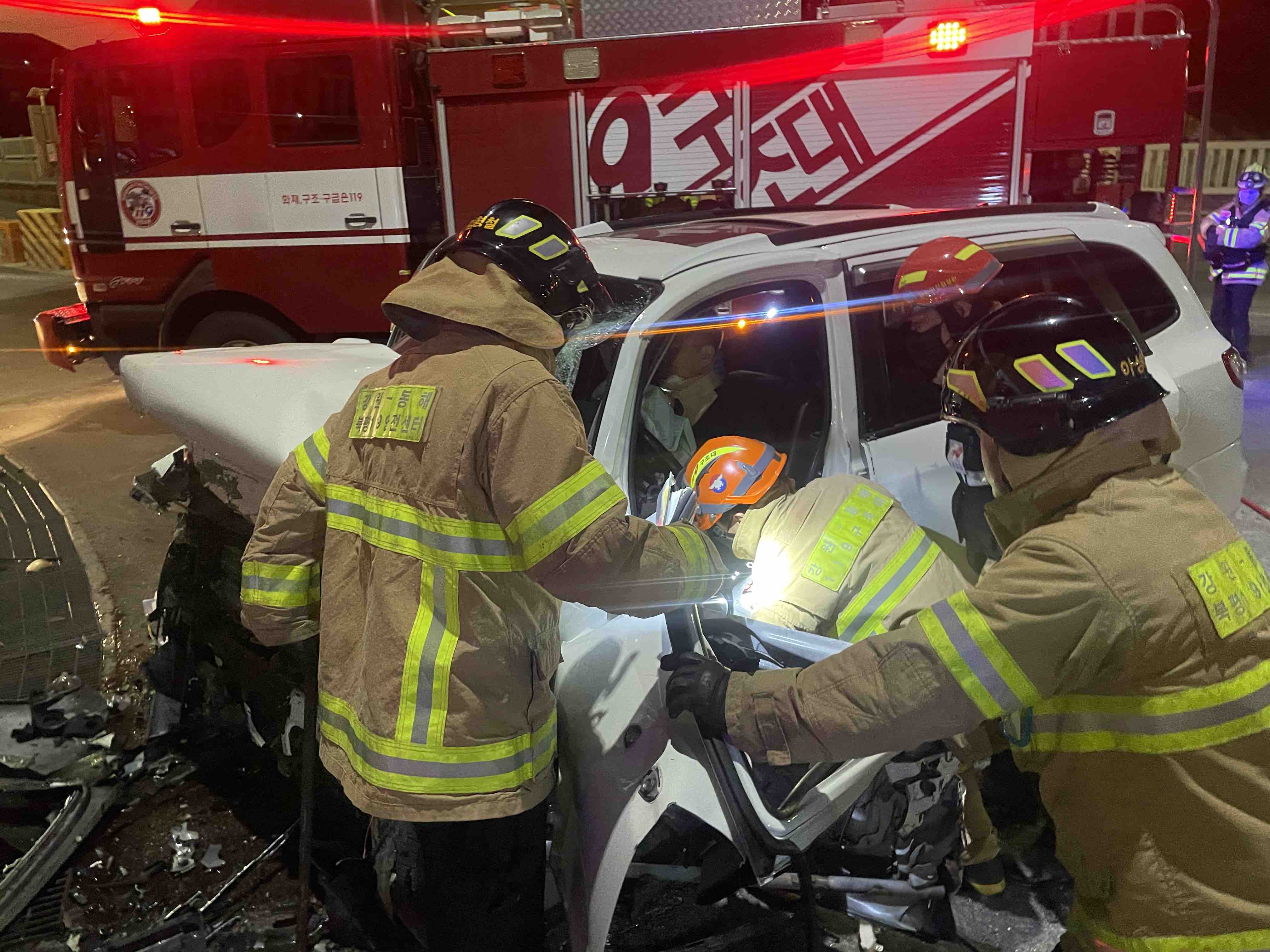 3. 내용: SUV차량 옹벽 정면 충돌로 2명 갇힘(운전석, 조수석)